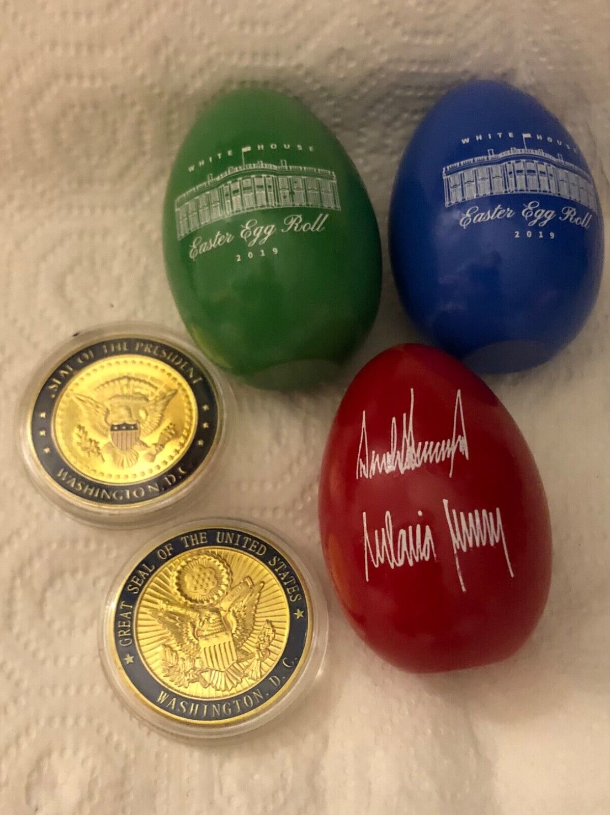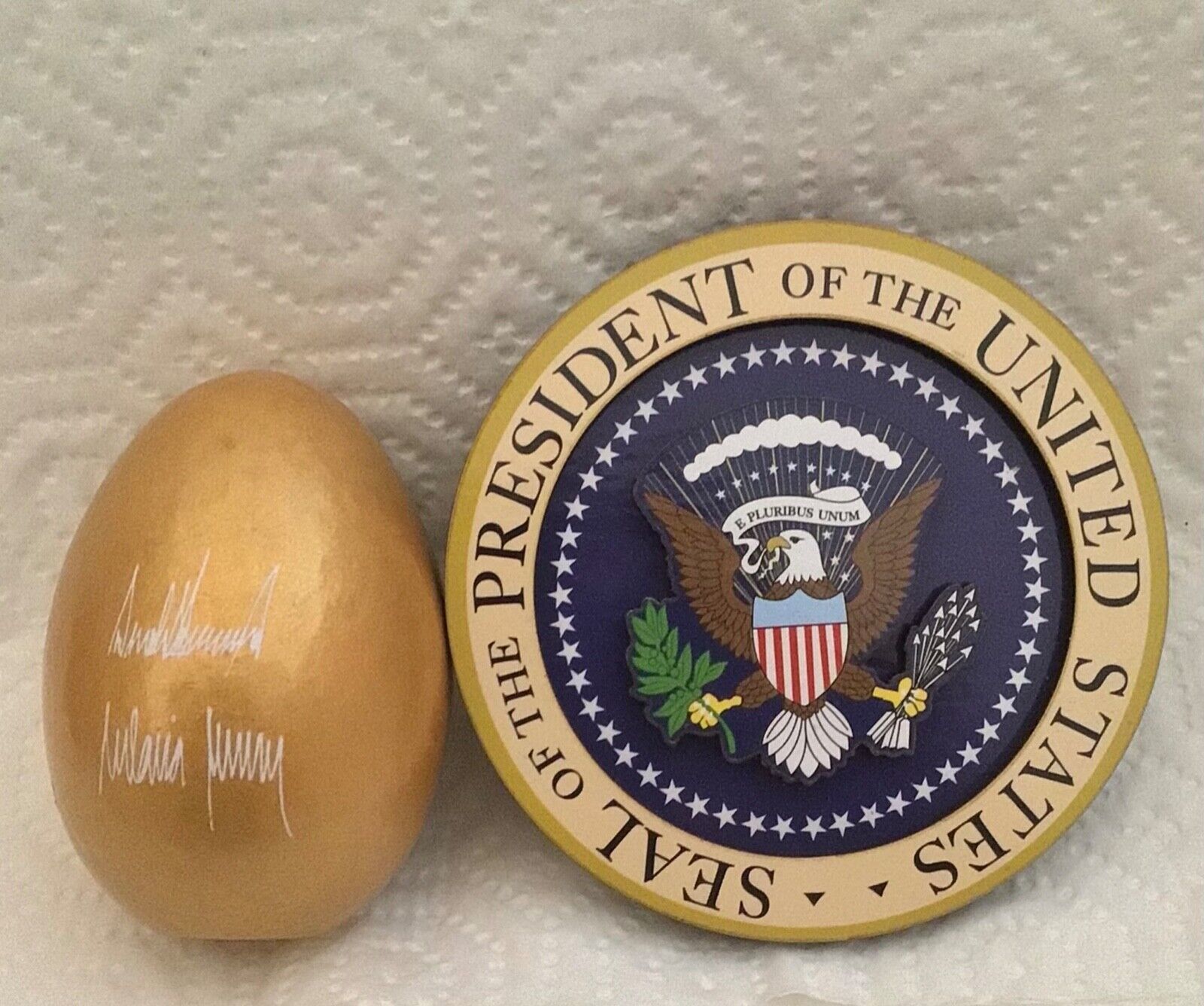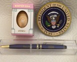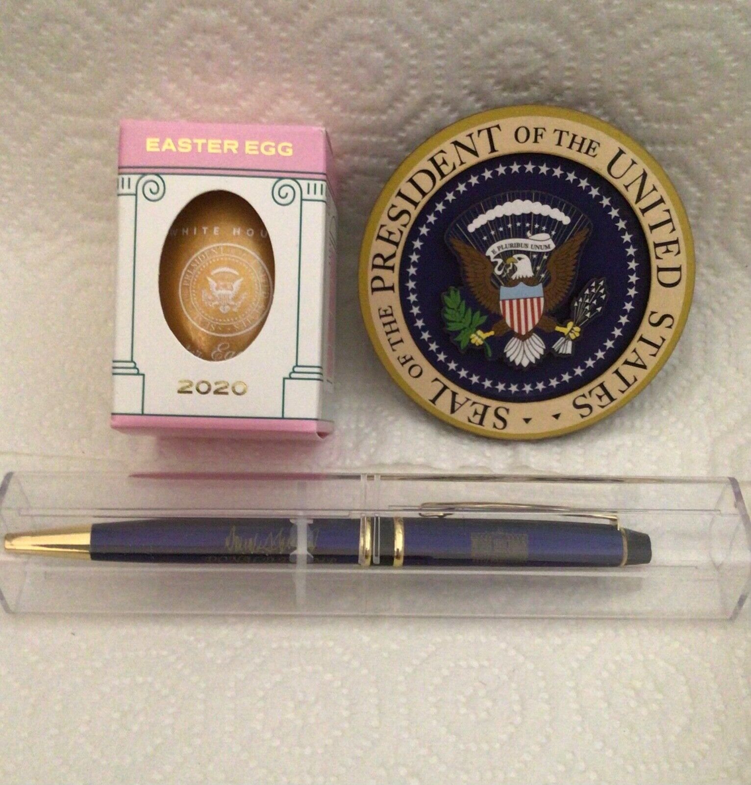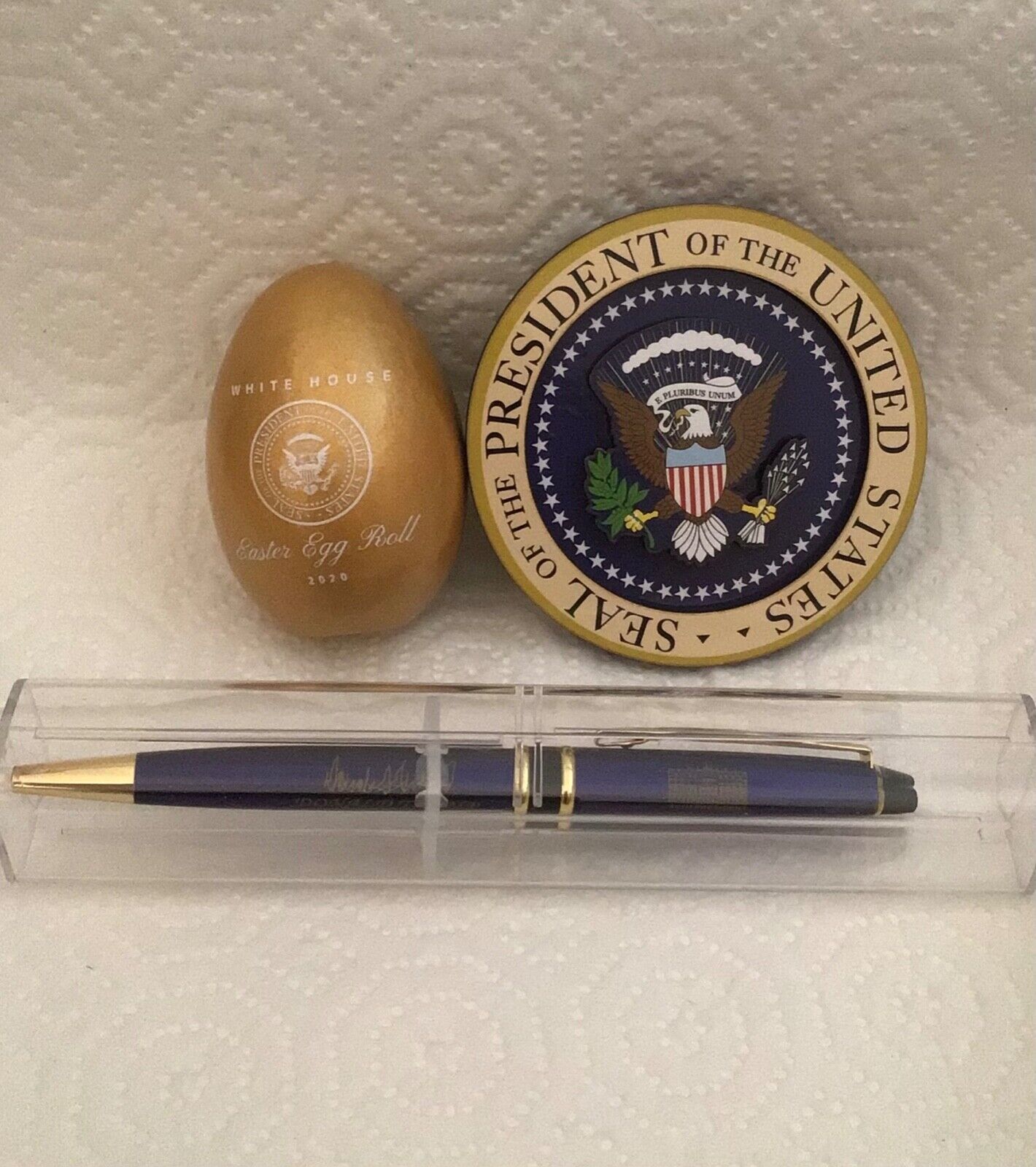 sale IS FOR THREE (3) GREAT PRESIDENT DONALD TRUMP WHITE HOUSE COLLECTIBLE ITEMS..AUCTION INCLUDES THE OFFICIAL WHITE HOUSE 2020 EASTER GOLD WOOD EGG IN ORIGINAL BOX, EAGLE SEAL WOODEN CARVED 3” MAGNET, ELEGANT HIGH QUALITY COBALT BLUE METAL LACQUER WITH GOLD SIGNATURE TRUMP REFILLABLE BALLPOINT PEN IN CLEAR CASE...EGG HAS FACSIMILE SIGNATURE OF DONALD MELANIA TRUMP.... PRESIDENTIAL EAGLE SEAL DESIGN IS ON THE FRONT OF EGG, ...2020 OFFICIAL ANNUAL EASTER EGG ROLL WAS CANCELLED ITEMS FROM THE EVENT ARE HARD TO FIND ...LAST 4 PHOTOS ARE TO SHOW OTHER ITEMS LISTED, THIS sale IS FOR 3 ITEMS IN FIRST PHOTO…THE OFFICIAL 2020 WHITE HOUSE SOUVENIR GOLD EASTER EGG THE MAGNET PEN..MY OTHER LISTING OFFER MANY MORE WHITE HOUSE AND PRESIDENTIAL ITEMS FOR SEVERAL PRESIDENTS...