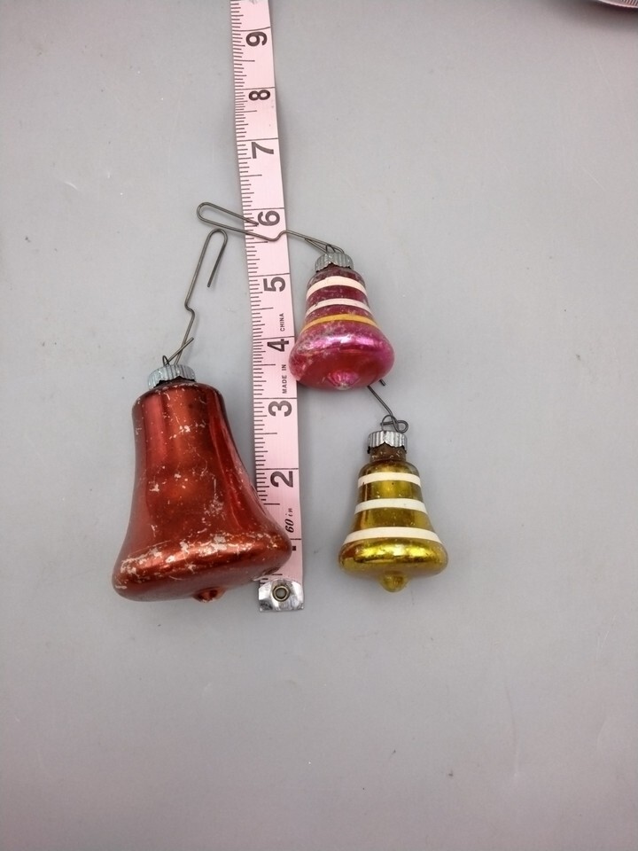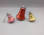- 3 VTG Bells Ornament SHINY BRITE Christmas Mercury Glass Pink Yellow 2" Stripe