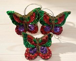 - 3 Vintage Butterfly Ornaments Sequin Beaded 3" Bejeweled Beaded green red