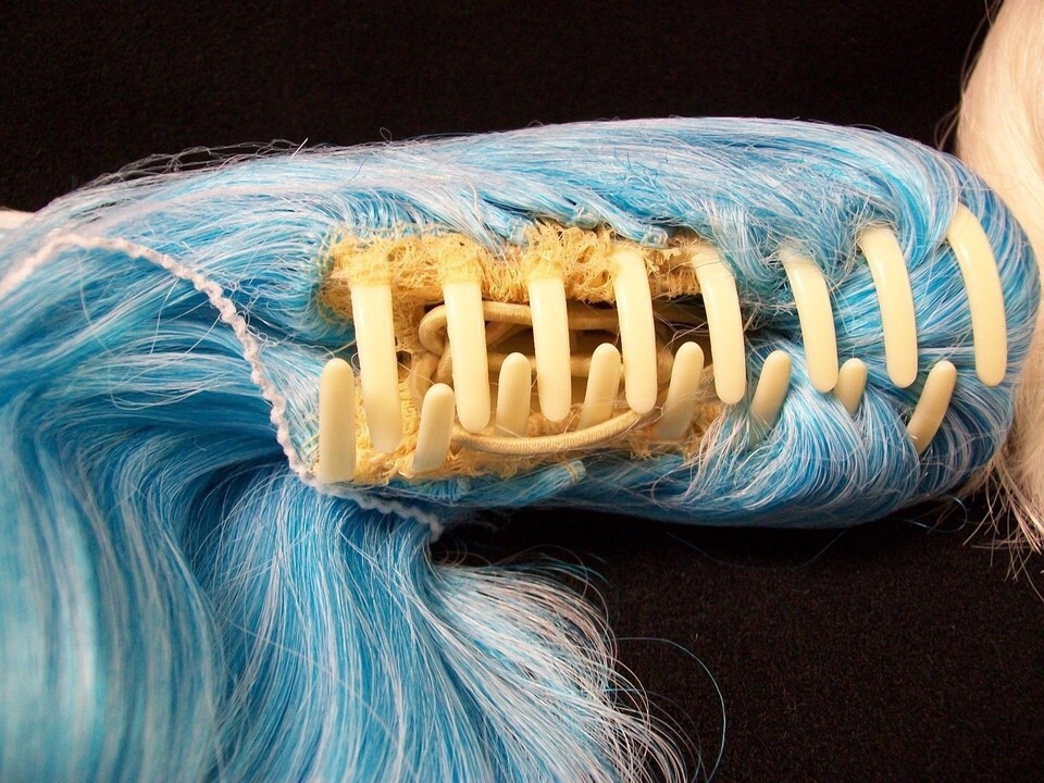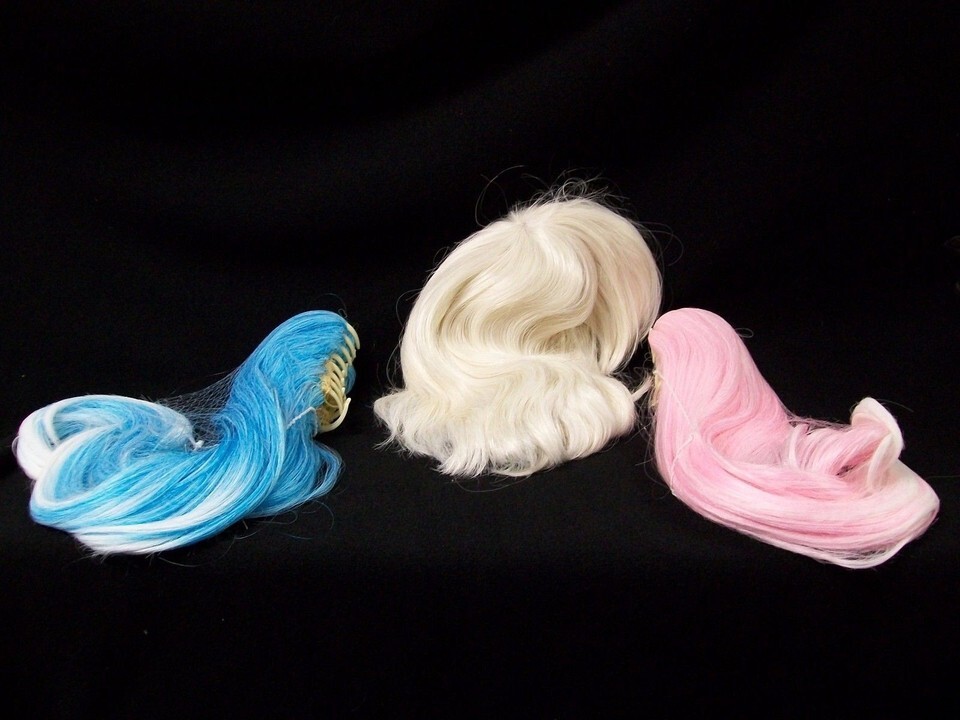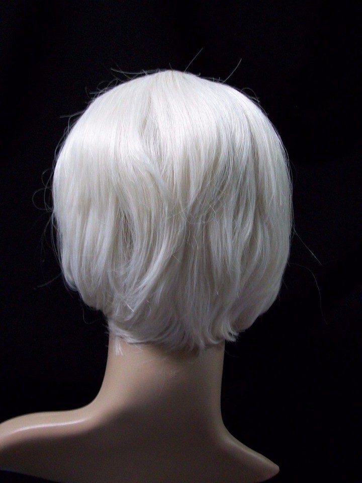 3 piece Deviant Doll Costume Wig. Wig is short layers with bangs. Wig color is a whitish blonde. Comes with 2 Clip on ponytails. One ponytail is Light Pink mixed with white. The other ponytail is Light Blue mixed with white. The white in the ponytail is not the same exact color as the main wig but it is barely noticeable. Wig can be worn alone or with clips. Clips can be positioned as desired. Can be worn with one clip as a single ponytail or both. Adult: One Size Fits Most. Adjustable Cap. Wig is a little on the heavy side with both ponytails attached. Can be used with other costumes.