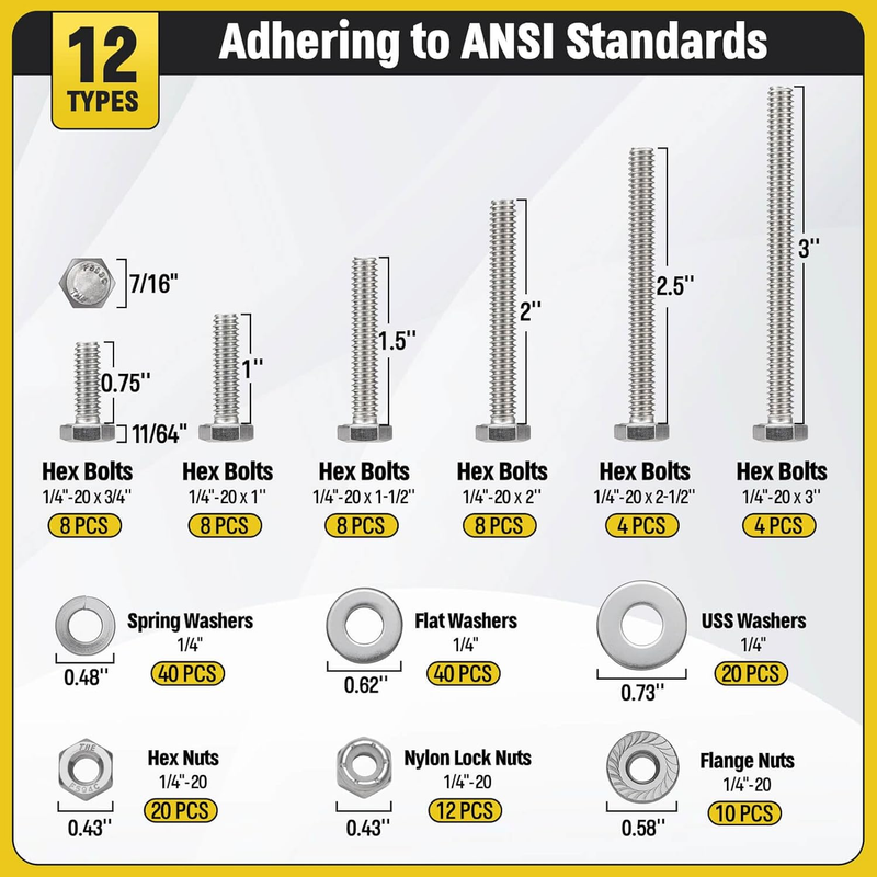 ?Includes, 1/4"-20 UNC bolts and nuts assortment includes 12 different types of items, reducing washers while adding nylon lock nuts, flange nuts, and USS washers to fulfill various needs. Your purchase is protected by Transparency.