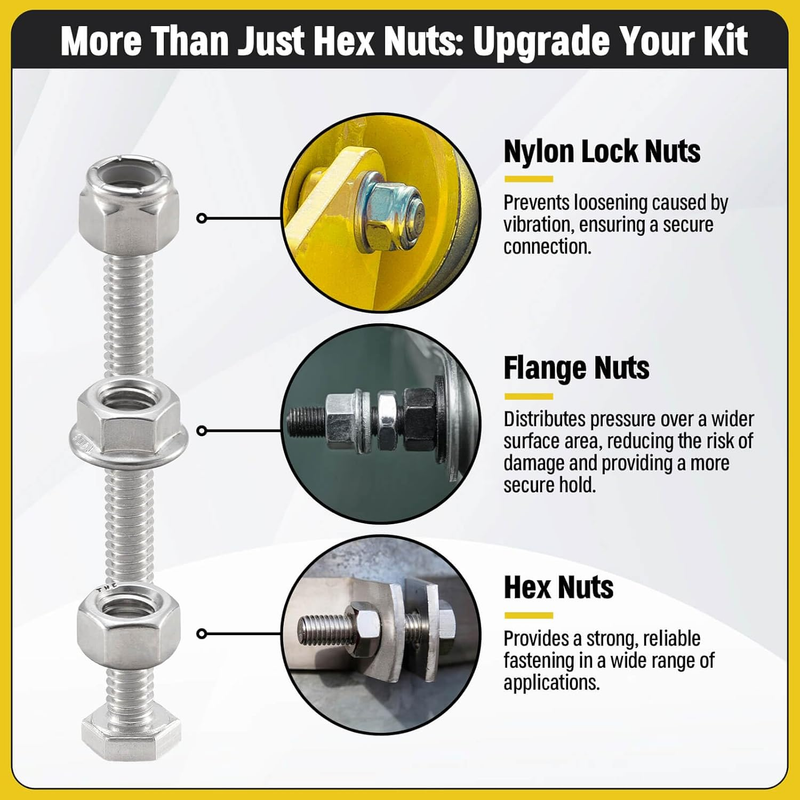 ?SAVE TRIPS TO THE HARDWARE STORE: Bid farewell to interruptions in work and trips to the hardware store for missing parts. This nut and bolt set facilitates safe and swift task completion, enhancing efficiency and ensuring you always have the right parts on hand.