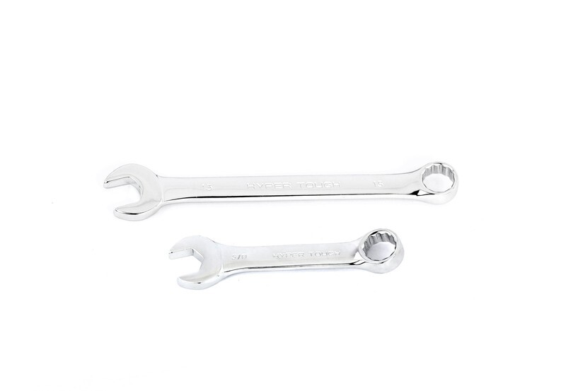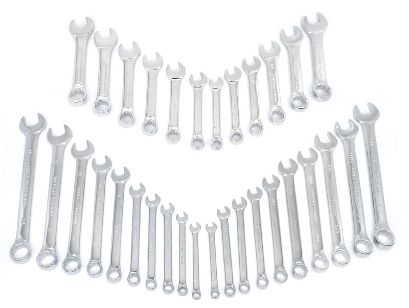 Hyper Tough 32-Piece Combination Wrench Set Chrome Vanadium Steel Heat Treated Mirror Polished Precision Machined Nickel Chrome Plated Meets ANSI/ASME standards 20 Piece Combination Sizes: 6, 7, 8, 9, 10, 12, 13, 15, 17, 18 MM 1/4, 5/16, 11/32, 3/8, 7/16, 1/2, 9/16, 5/8, 11/16, 3/4" 12 Piece Stubby Sizes: 10, 11, 12, 13, 14, 15 MM 5/16, 3/8, 7/16, 1/2, 9/16, 5/8"