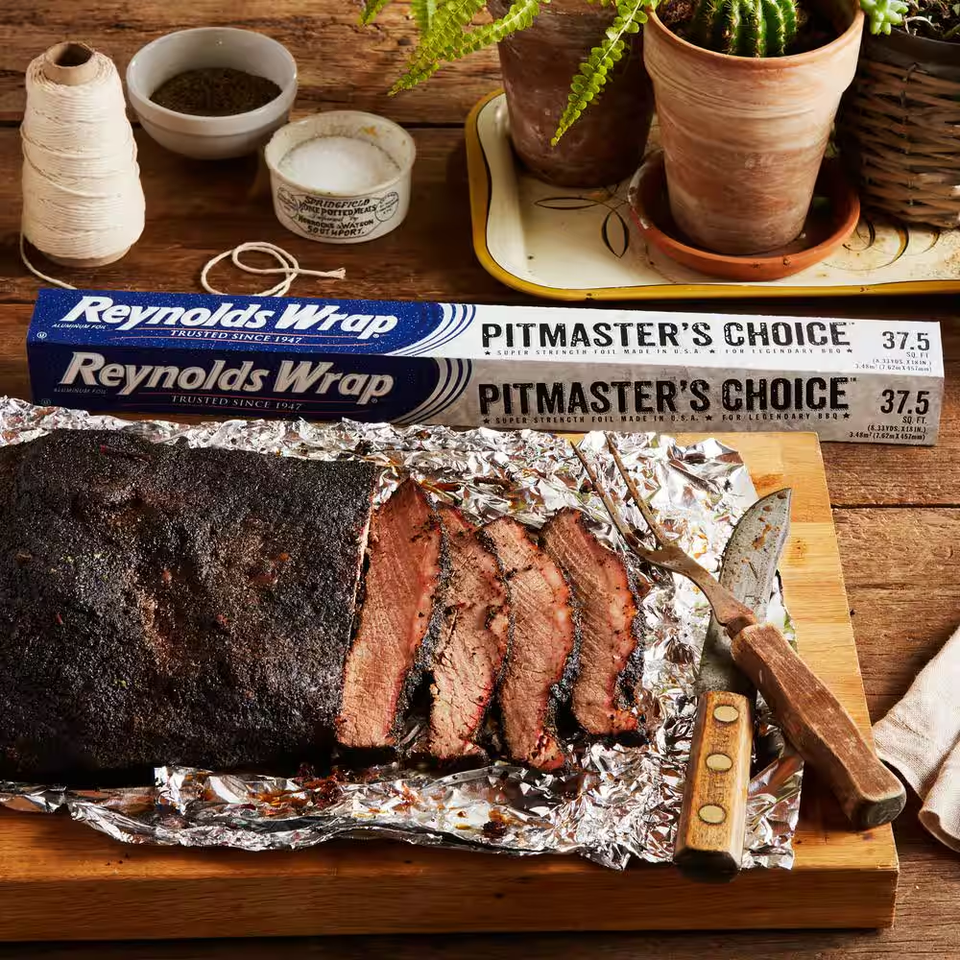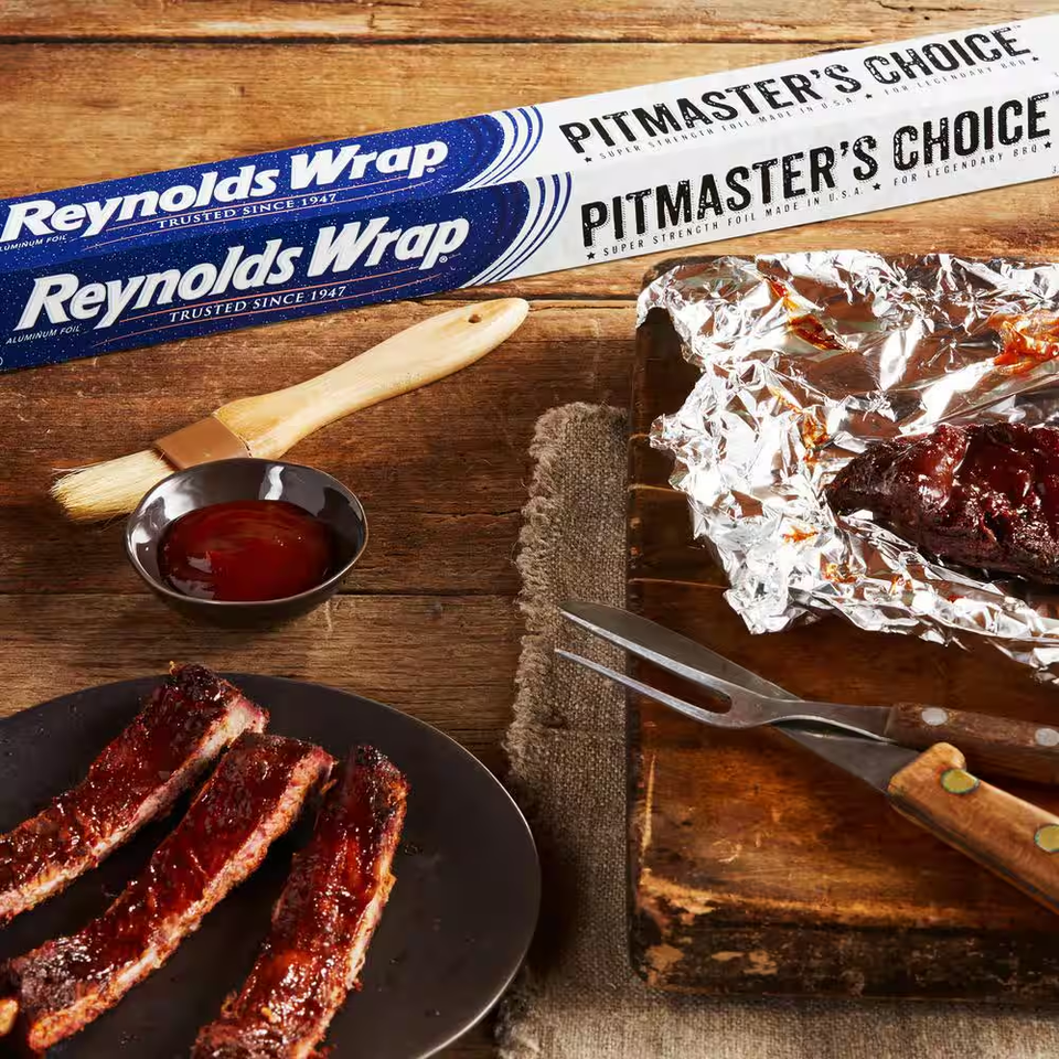Reynolds Wrap Pitmaster's Choice Heavy Duty Aluminum Foil takes your barbecue to the next level with a thick, heavy duty construction that holds up to your biggest cooking tasks. Featuring an ample 18 in. W, this roll of heavy duty foil fits large hams, big briskets and other large cuts of meat in one sheet to make barbecue prep easier. This heavy duty aluminum foil also works for roasting or baking your favorite family-style dishes. Use this tin foil wrap to lock in some serious flavor and moisture in a ham or roast, or line your pans with this cooking foil for easy cleanup without lots of scraping and scrubbing. This disposable grilling foil is also highly resistant to tears and punctures no matter how you use it, so you don't have to worry about ripping the wrap when you're prepping your food. Whether you're a beginning barbecuer or a professional pitmaster, your dishes come out moist and flavorful with a little help from this heavy duty Reynolds Wrap aluminum foil.