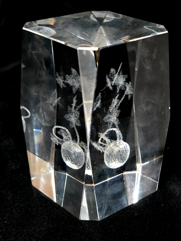 - 3D Laser Etched Crystal Paperweight Display - Butterflies & Fruit - 3.125”