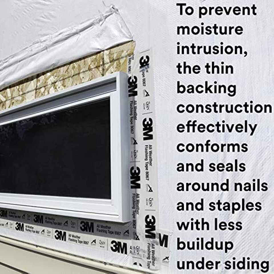 3M All Weather Flashing Tape 8067 is a self-adhered, waterproof flashing membrane designed for sealing around openings and penetrations in exterior walls. This product has a unique acrylic pressure sensitive adhesive that aggressively sticks and stays stuck both at lower and higher application temperatures than traditional flashing tapes. It can be applied to materials without primers or staples and bonds in surface temperatures from 0 to 176F (-18 to 80C) per AAMA 711-05. It even adheres to damp surfaces. To prevent moisture intrusion, the thin backing construction effectively conforms and seals around nails and staples with less buildup under the siding. This backing is also tough, resists punctures and tears, yet it is thin to fit conveniently into corners and under the siding. Proprietary construction will not liquefy, bleed, or melt in contact with many building sealants or in extreme summer temperatures. The split paper release liner provides fast application with easy and accurate positioning of the tape Recommended applications include: sealing joints around sills, jambs and heads of rectangular windows in wood frame construction; sealing around other wall interruptions in non-roof areas, such as thresholds, dryer vents and hose bibs; when installed properly as a concealed flashing in vertical walls in frame construction, it prevents moisture intrusion or water leaks and avoids the costly problems caused by water infiltration.