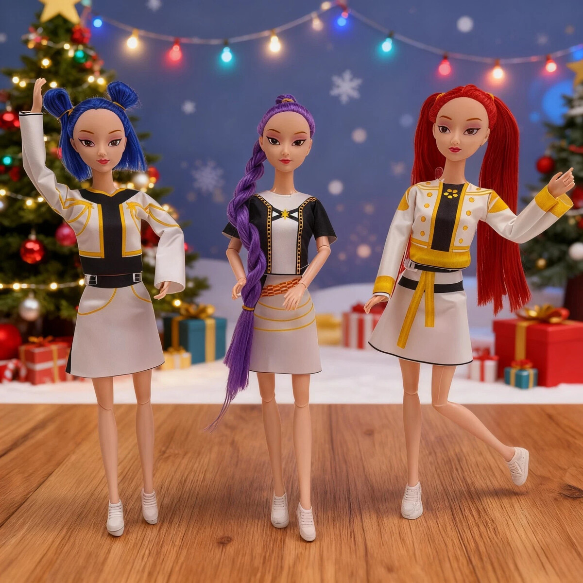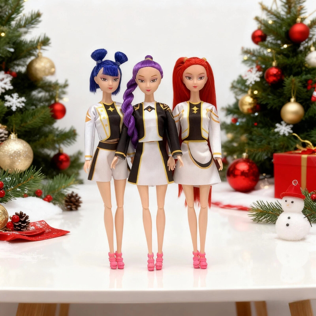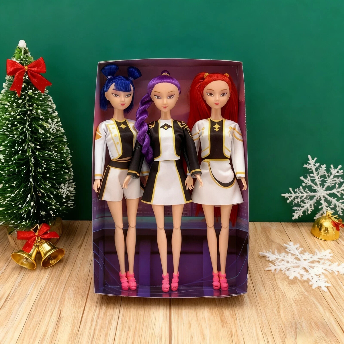 The 3Pcs Set Kpop Demon Hunters Dolls are collectible figure toys featuring girl dolls with straight hair and a light complexion. These artist dolls come with music and light features, making them a unique addition to any doll collection. Manufactured in 2025, these durable vinyl dolls are part of the Pop Culture Barbie product line, perfect for fans of Kpop and demon hunters themes. Ideal for Christmas gifting, these original dolls offer a fun and interactive play experience for collectors and enthusiasts alike.