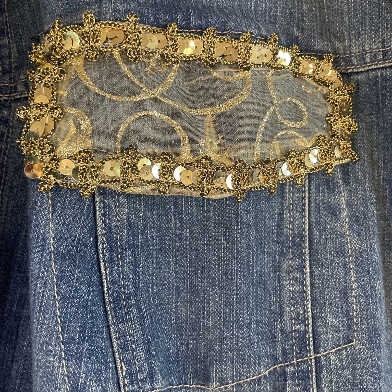Pre-owned, clean, very cute? cutter in person then in photos due to the sparkly gold accents on the neck and pockets. Four pockets total.