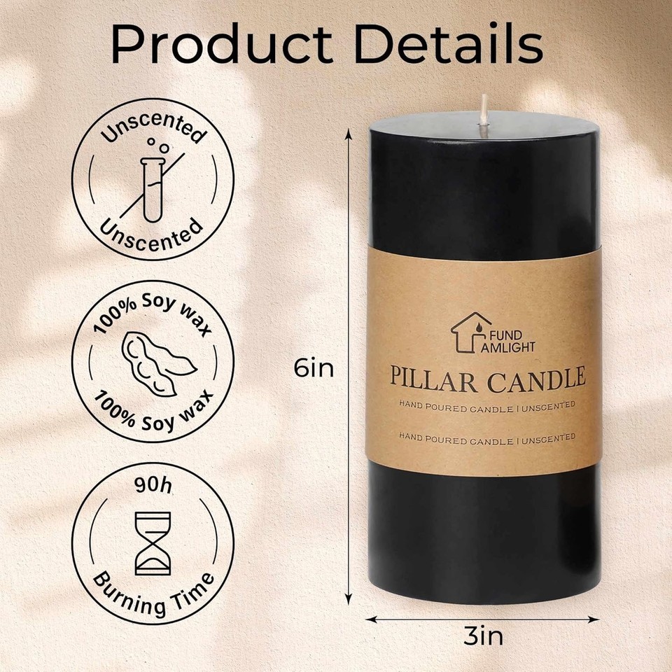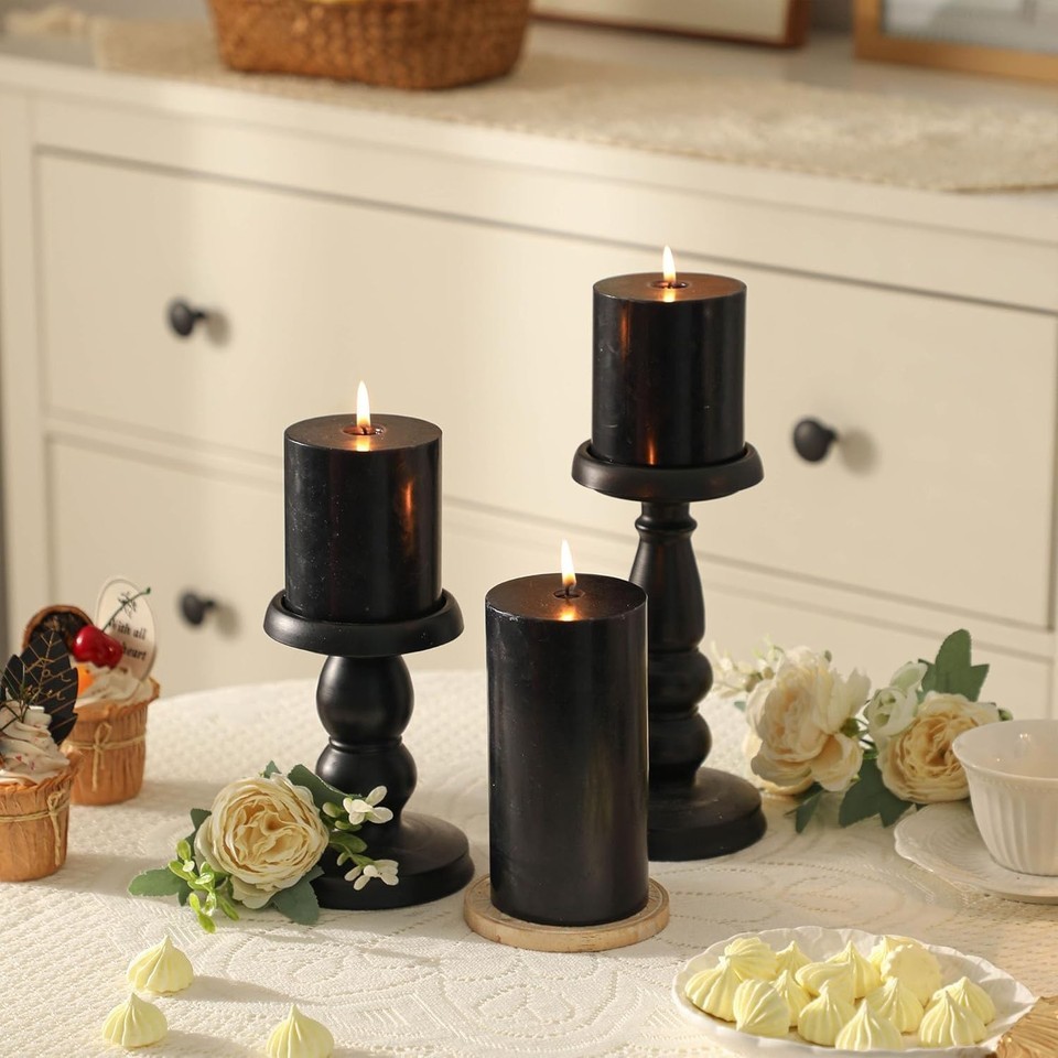 [Festive Fall Decor]: Sleek black design complements Halloween pumpkins, Thanksgiving tablescapes, or autumn centerpieces. Pair with fairy lights or faux foliage for seasonal charm.Pillar candles also can be used for everyday decorations, holiday decorations, mantel decorations, table decorations.