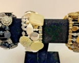 This 3-piece vintage button bracelet is handmade in the United States and features various golden tone buttons strung on an elastic band with safety pins for secure wear. The bracelet has a charm type of buttons and a style of a button bracelet, making it a unique and stylish accessory for any occasion. The combination of silk and buttons as the main material adds a touch of elegance to the design, and the 7-9 inch length ensures a comfortable fit. This handmade bracelet is a classic piece of jewelry that brings a vintage flair to any outfit.