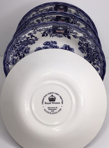Add a touch of elegance to your dinnerware collection with these exquisite Royal Wessex Queens Churchill Tonquin Blue Soup, Cereal, and Salad bowls. The set of 4 round-shaped porcelain bowls features a shiny finish and a beautiful floral pattern in royal blue. Perfect for all occasions, these 8" bowls are microwave and dishwasher safe, making them easy to use and maintain.