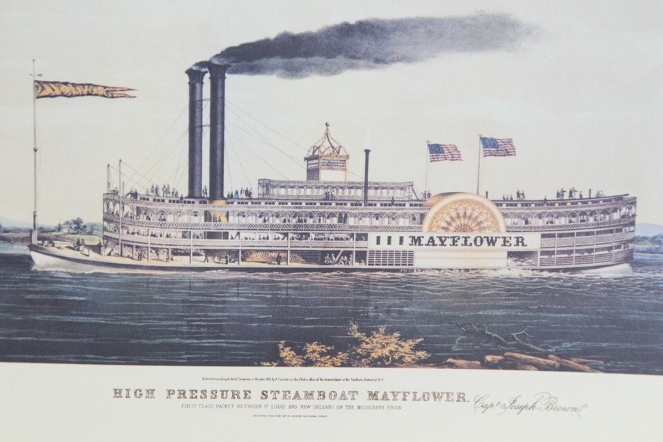 4 Currier & Ives Steamboat Prints Midnight Race Columbia Mayflower Drew St John