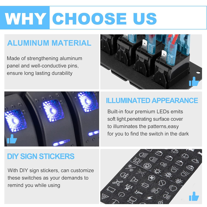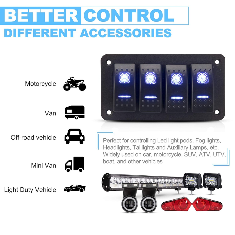 BETTER CONTROL DIFFERENT ACCESSORIES: 4 gang switch panels are perfect for controlling LED light pods,fog lights,headlights,taillights and auxiliary lamps,etc.Come with DIY sticker, you can define the name and assign switches according to your needs