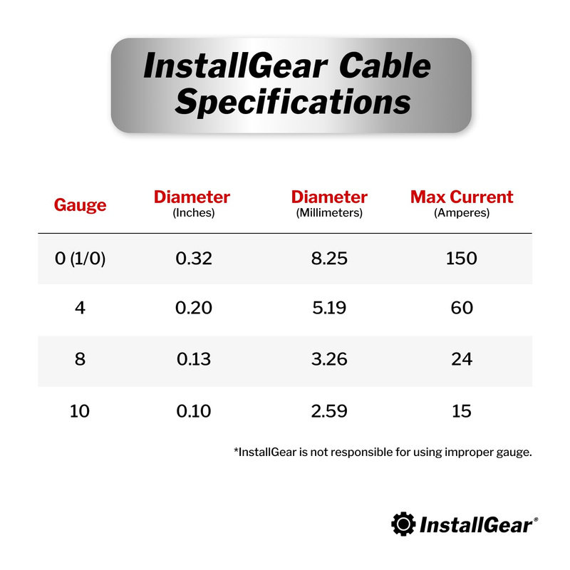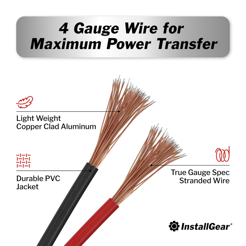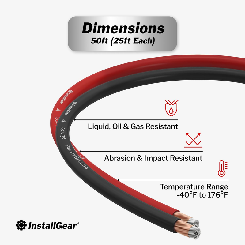 25-FEET (7.62m) [ 25FT RED + 25FT BLACK 4 GAUGE POWER/GROUND WIRE ] - The lower the gauge number, the thicker the wire. Thicker wire presents less resistance to current flow.