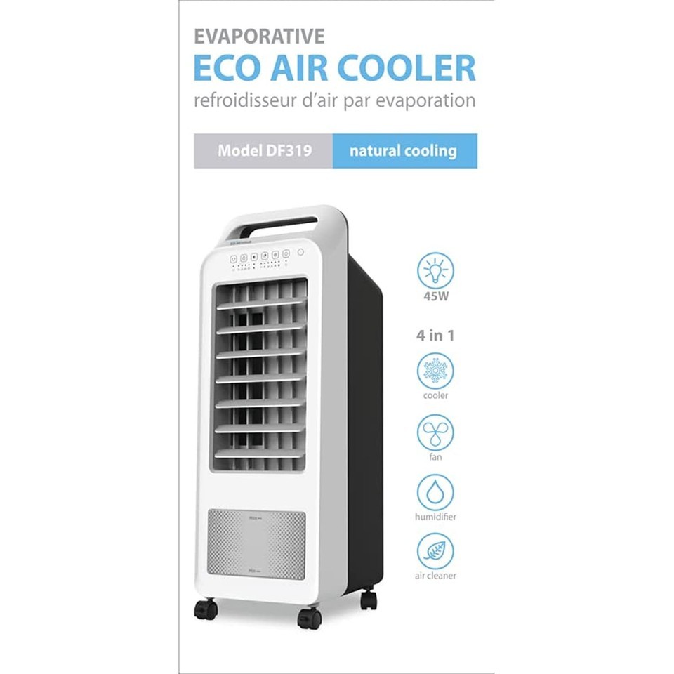 ECO AIR COOLERS use evaporative cooling to provide airflow that is cooler than the surrounding air. Water is pumped up and dripped onto the cooling pad and as hot air is pulled through, the water in the cooling pad evaporates. Evaporation absorbs heat, dropping the temperature of the air flowing from the cooler. As a result, the airflow is much cooler than the ambient air.; ; Brand Name: Floater Imports Cooling Zone: 150 sq ft Portable: Yes Product Type: Evaporative Cooler Air Volume: 68 CFM Remote Control: Yes Number of Speed Settings: 3 sheet ETL Listed: Yes Packaging Type: Boxed Commercial or Residential: Residential UL Listed: No Volts: 120 V Color: White Height: 28 in. Width: 11 in. Depth: 12 in. Capacity: 1.45 gal Functions: Air cooler, fan, air cleaner and humidifier Power: 45 watts Weight: 11.9 lbs.