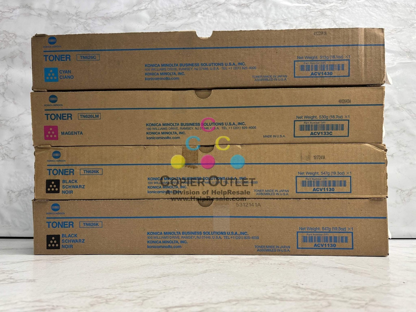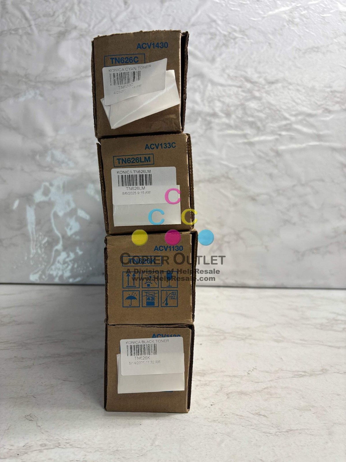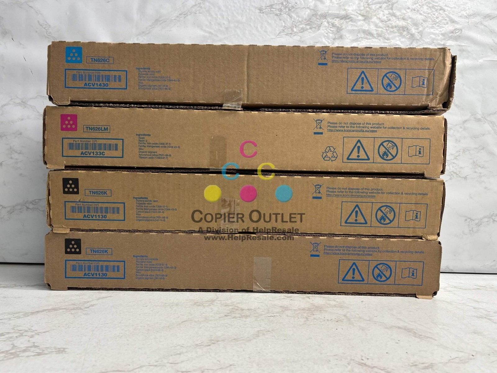Lot of 4 New Genuine Konica TN626 Cyan, Magenta, Black Toner (No Yellow) Cyan TN626C ACV1430 x 1Magenta TN626M ACV133C x 1Black TN626K ACV1130 x 2 New Same Day Shipping For BizHubC250i,C300i,C360i,C450i C550i C650i Listed By: Renee (Sales Team) ?your education is a dress rehearsal for a life that is yours to lead? -Nora Ephron (A positive moment brought to you by Help Resale) Copier Outlet (A Division of Help Resale) Copier Outlet was established in 1993. We buy and sell both domestically and internationally and have wide assortment of copiers, consumable and accessories of all popular brands. All of our copiers are in house and available for your inspection. They all have been tested and rated for functions, cosmetics and overall appearance. Our consumable and accessories selections include toners, imaging units, developers and copier parts such as fax board, fixing unit, fuser unit, roller, cleaning brush, drum blades and etc. For more detailed information on our copiers, consumables and accessories, please feel free to give us a call. We are more than happy to assist you with the pricing and guide you to find the copiers, consumable and accessories you wish to buy. Best Regards, Copier Outlet Sales Team Monday - Friday: 9:00 am to 5:00 pm (PST) Copier Clearance Center Promo Video - YouTube Video will open in a new windowUsing the App? Paste link into a browser window: [isdntekvideo] All product and company names are trademarksTM or registered trademarks of their respective holders. Use of them does not imply any affiliation with or endorsement by them.