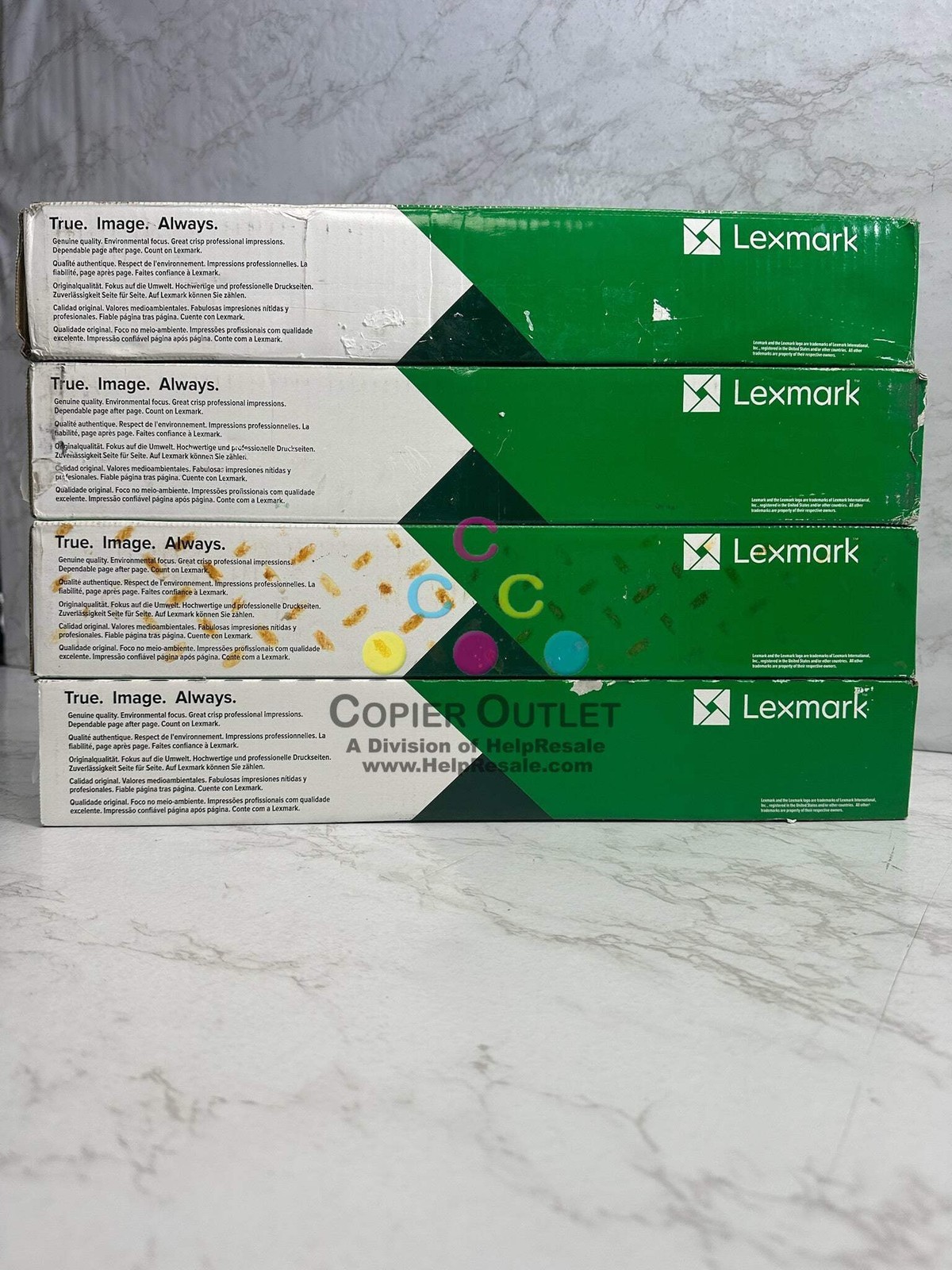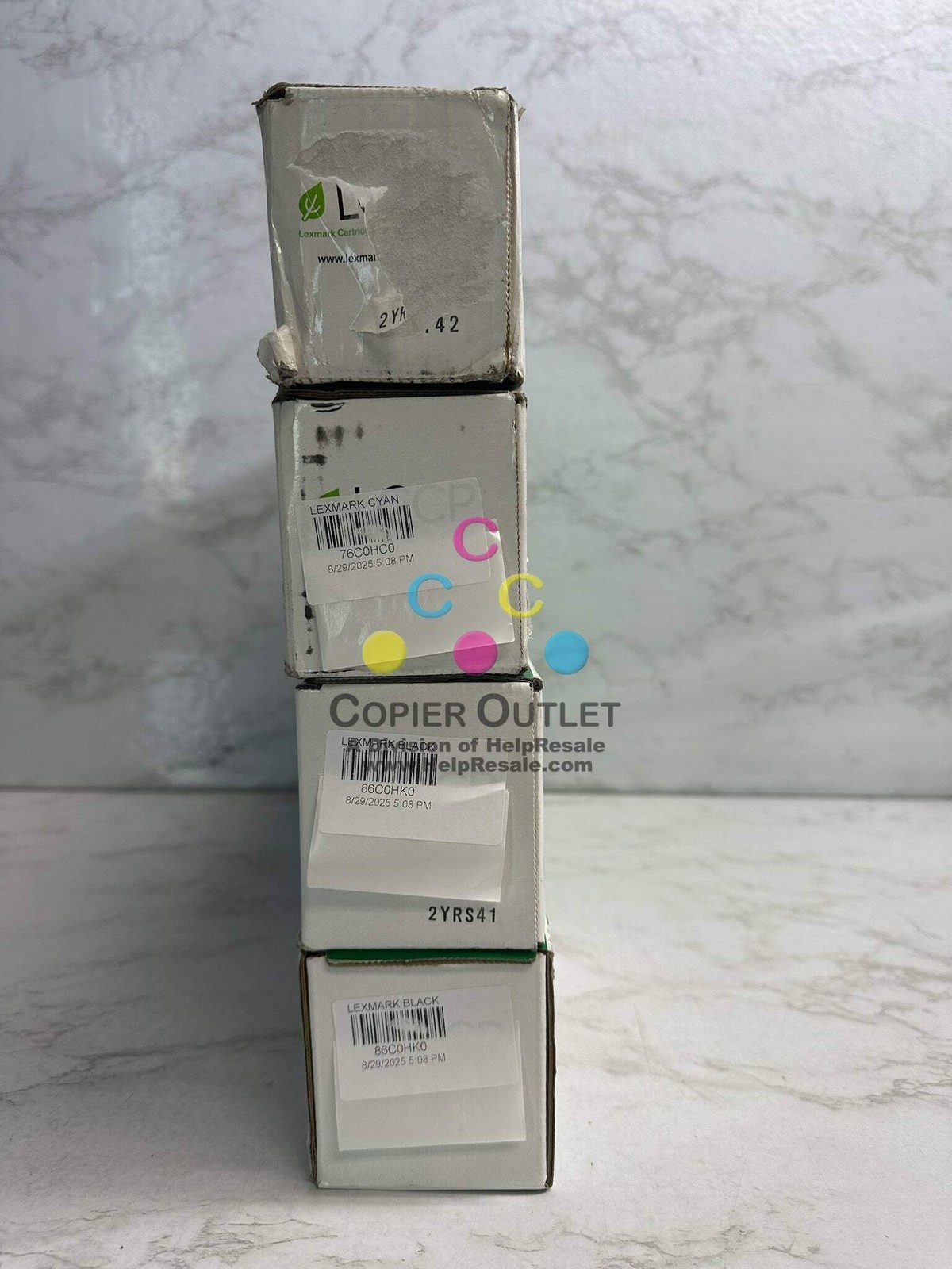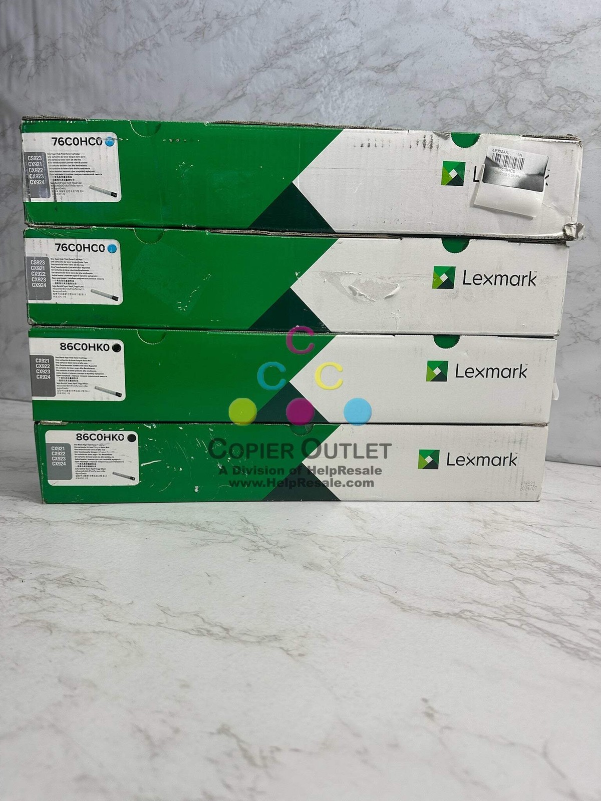 4 New OEM Lexmark 76C0HC0, 86C0HK0 Cyan and Magenta High Yield Toners Cyan 76C0HC0 x2, Black 86C0HK0 x 2 (No Yellow and Magenta Toners) NEW Same Day Shipping FOR CX922de,CX921de,CX923dxe,CX923dte,CX924dxeCX924dte,CS923de Listed By: Renee (Sales Team) ?Wherever you go...there you are...and if you go some where else...you?ll be there too.? -RRW (A positive moment brought to you by Help Resale) Copier Outlet (A Division of Help Resale) Copier Outlet was established in 1993. We buy and sell both domestically and internationally and have wide assortment of copiers, consumable and accessories of all popular brands. All of our copiers are in house and available for your inspection. They all have been tested and rated for functions, cosmetics and overall appearance. Our consumable and accessories selections include toners, imaging units, developers and copier parts such as fax board, fixing unit, fuser unit, roller, cleaning brush, drum blades and etc. For more detailed information on our copiers, consumables and accessories, please feel free to give us a call. We are more than happy to assist you with the pricing and guide you to find the copiers, consumable and accessories you wish to buy. Best Regards, Copier Outlet Sales Team Monday - Friday: 9:00 am to 5:00 pm (PST) Copier Outlet Promo Video - YouTube Video will open in a new windowUsing the App? Paste link into a browser window: [isdntekvideo] All product and company names are trademarks TM or registered trademarks of their respective holders. Use of them does not imply any affiliation with or endorsement by them.