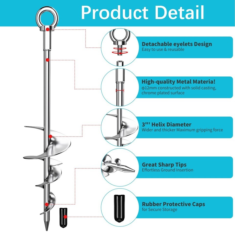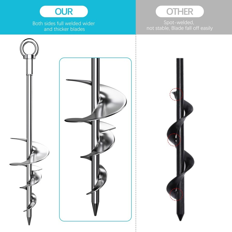 Premium Quality - Our ground anchor kit are made with 12mm(On the market are 9mm) diameter high quality steel , full welded wider spirals, compared with the spot welding on the market, our blades are more solid, upgraded spiral blades like a screw penetrates wood, hold strongly no matter hard soil or sandy island, can save half of the efficiency and more stability