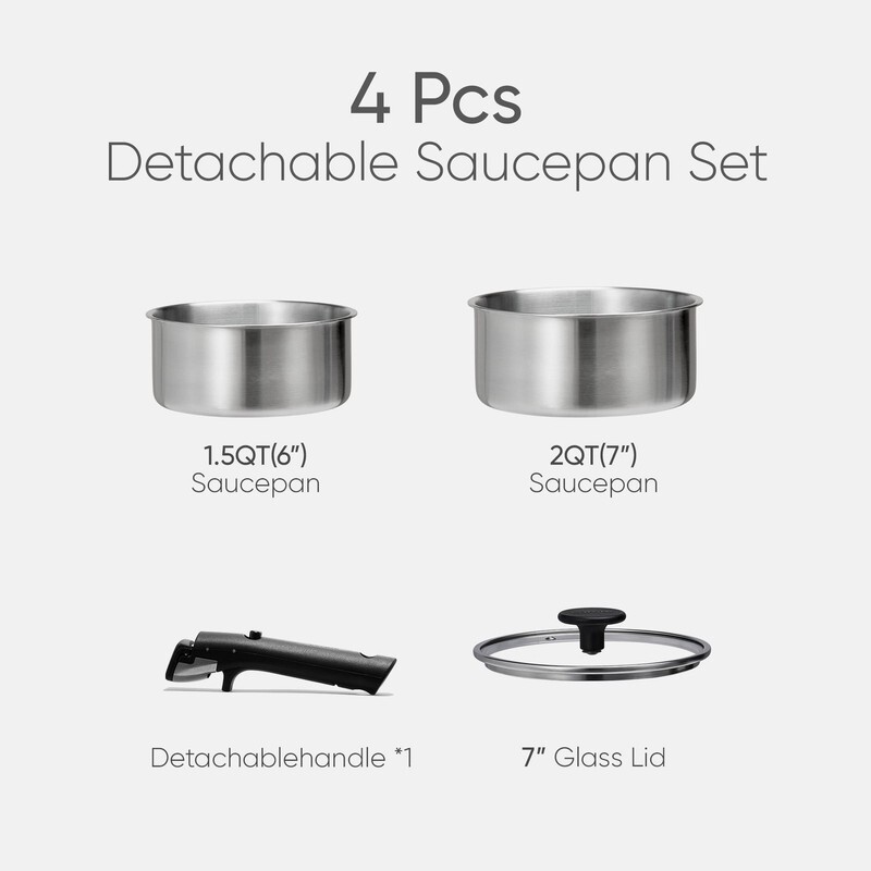 Features a high-performance stainless steel-aluminum core-stainless steel design for rapid, even heating and professional-grade cooking precision. Features detachable handles for effortless storage, fitting seamlessly into even the most compact kitchens?no more bulky pots taking up unnecessary space. Made with premium 18/10 stainless steel that resists rust, corrosion, and chemical leaching for safer, healthier meals. Up to 600F for versatile stovetop-to-oven cooking. Easy to clean and dishwasher-safe for effortless clean. Designed for induction, gas, and ceramic hobs, our cookware ensures fast and even heat distribution on any heat source. 6"(1.5QT) 7"(2QT) Saucepan, 7" Glass Lid, Removable Handle. All cookwares set offer 12 months warranty for any quality issue. Please feel free to contact us.