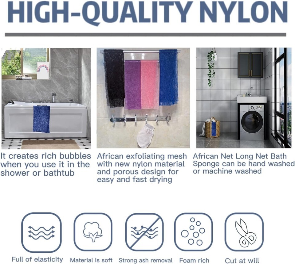 High-Quality Materials: Crafted from new type nylon that is durable, lightweight, and designed for long-lasting use. Its porous nature ensures quick drying and easy soap lathering.