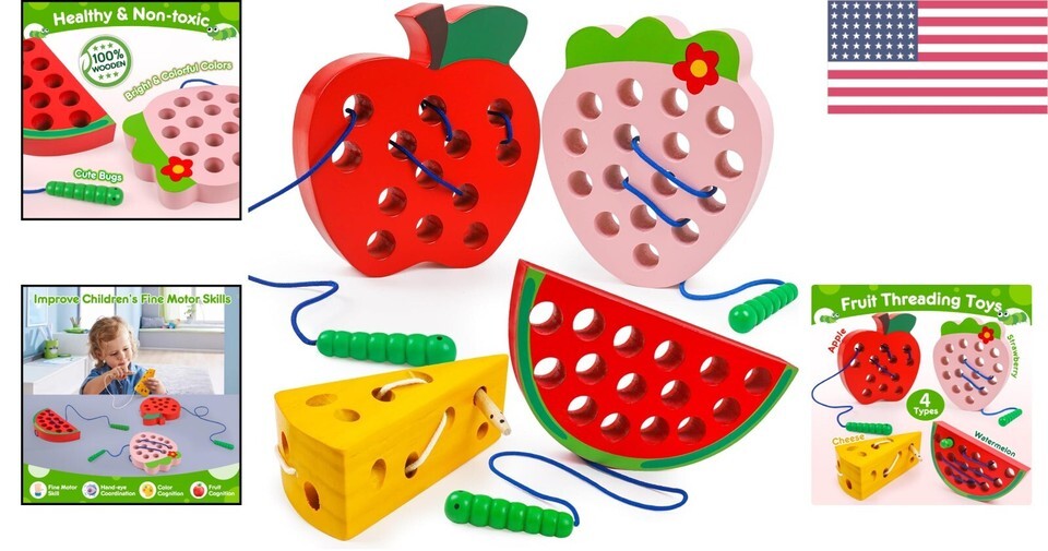 As children thread the lacing cord through the holes of each fruit, they enhance their dexterity, creativity, and problem-solving abilities.