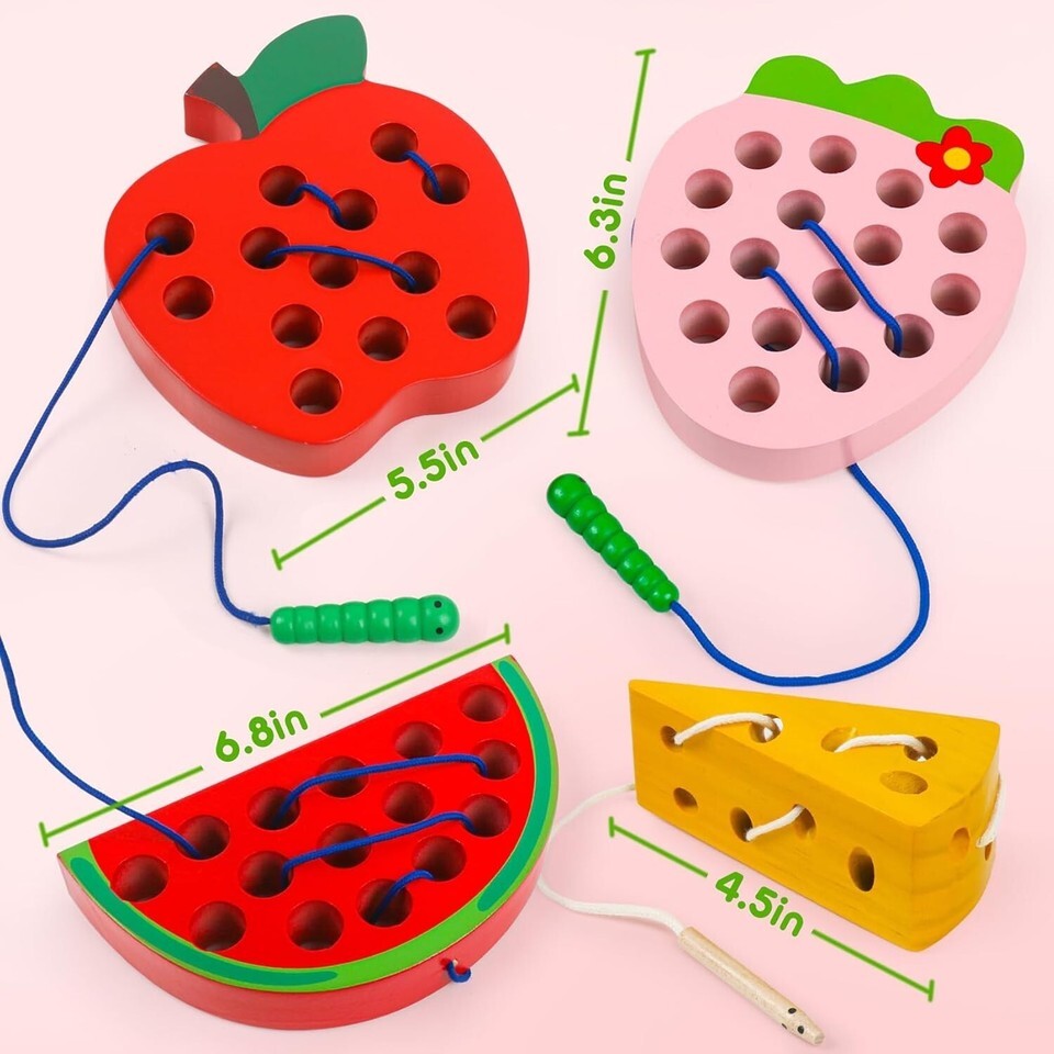 Our lacing set features four delightful wooden fruit shapes: an apple, a watermelon, a cheese, and a juicy strawberry.