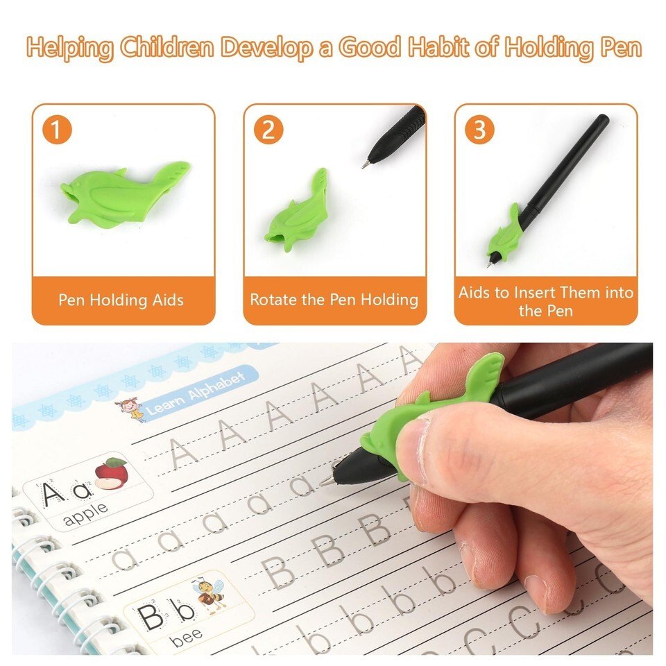 Grooved Design: The writing practice has three-dimensional groove design, which is convenient for kids to follow and trace. Help kids master handwriting skills. Magic grooved writing practice paper is thick, strong, and durable, not easy to smudge. The pen holder is made of silicone, which is safe for children