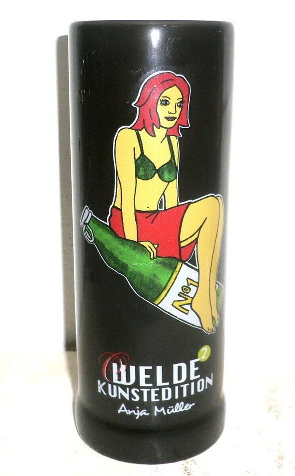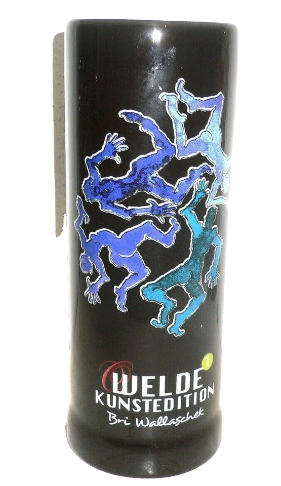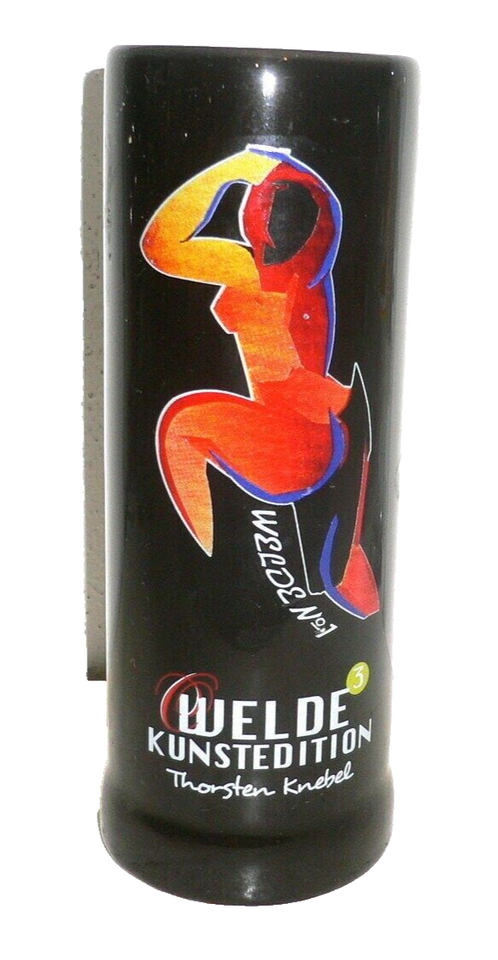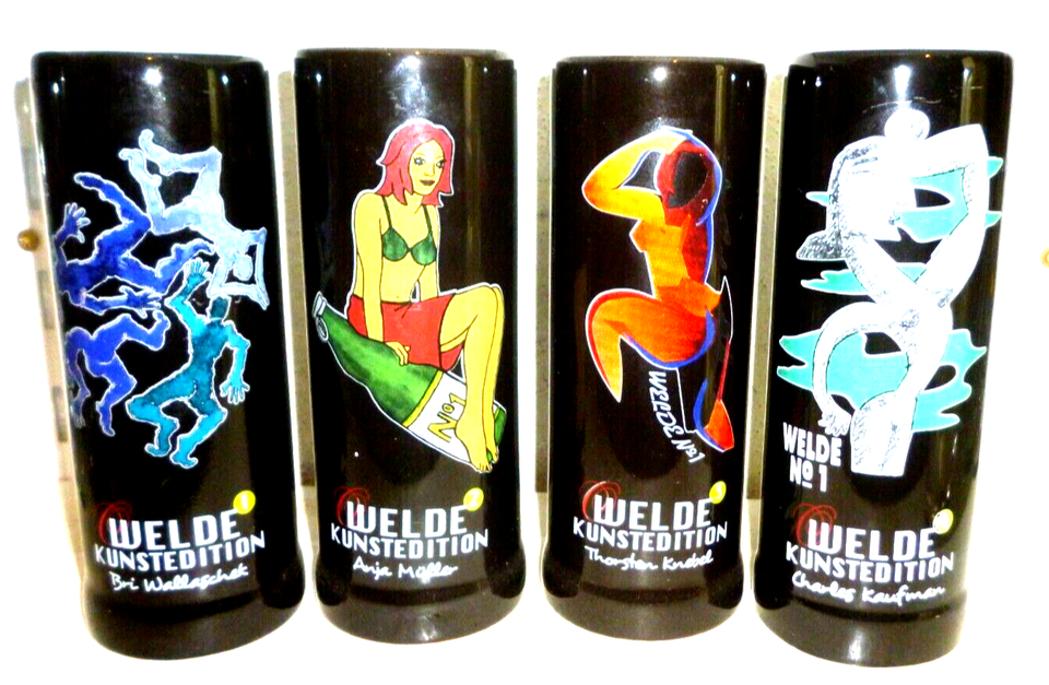 For sale is a wonderfull Set-of-4 rare, limited-edition, ceramic Welde Art Edition Seidel beerglasses (with Handle on the Back) from the Welde Brau brewery in Schwetzingen, Germany.