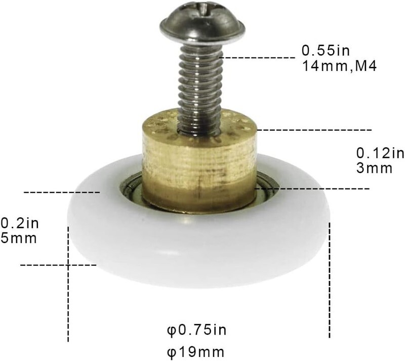 Wheel thickness :5mm, comes with screws,steel part of the wheel: 9mm diameter x 3mm height;suitable for 4-6mm thick shower door