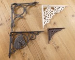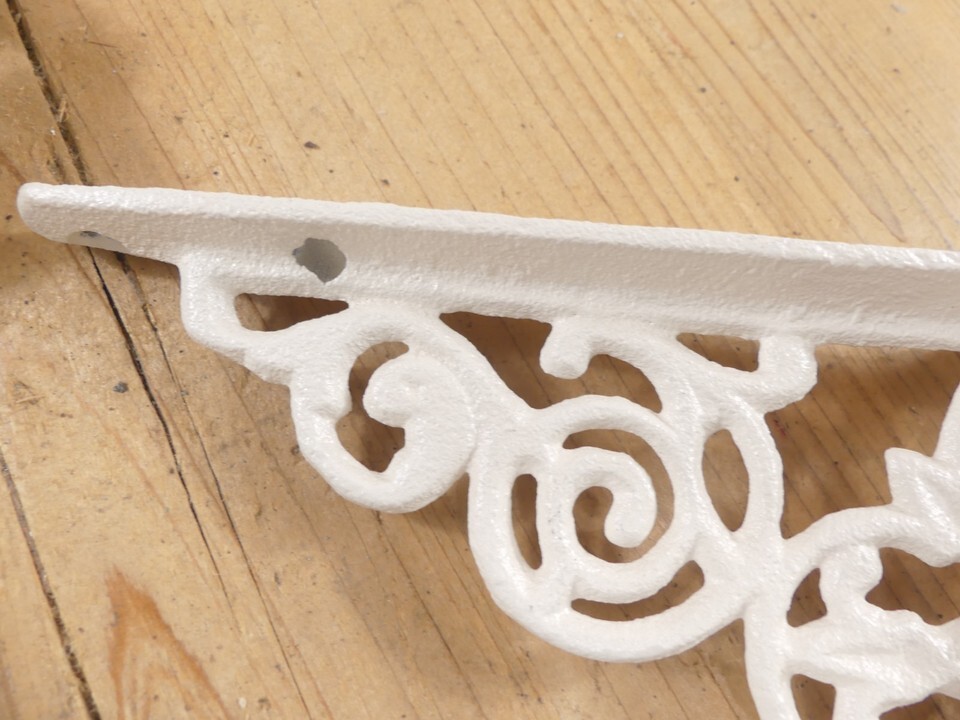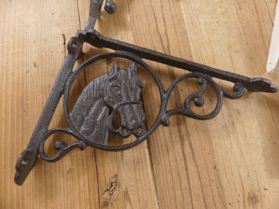 PLEASE BE AWARE THESE HAVE SOME DEFECTS. THE HORSE BRACKETS HAS A SMALL CRACK, THE WHITE BRACKET HAS SOME HOLES IN THE CASTING, THE SMALL RUSTIC BRACKET HAS A CHIP IN THE CASTING, AND THE REMAINING BRACKET HAS ROUGH PATCHES IN THE CASTING. PLEASE BE AWARE OF THIS. NO RETURNS.