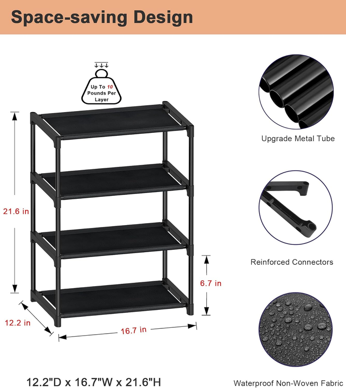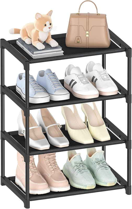 4 Tiers Small Shoe Rack,Narrow Stackable Shoe Shelf Organizer,Sturdy Shoe Stand, Non-Woven Fabric Metal Shoe Racks for Entryway, Doorway and Bedroom Closet