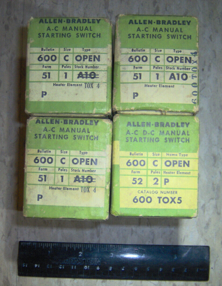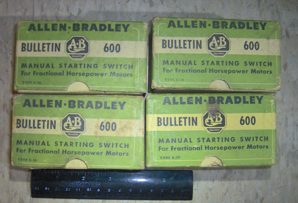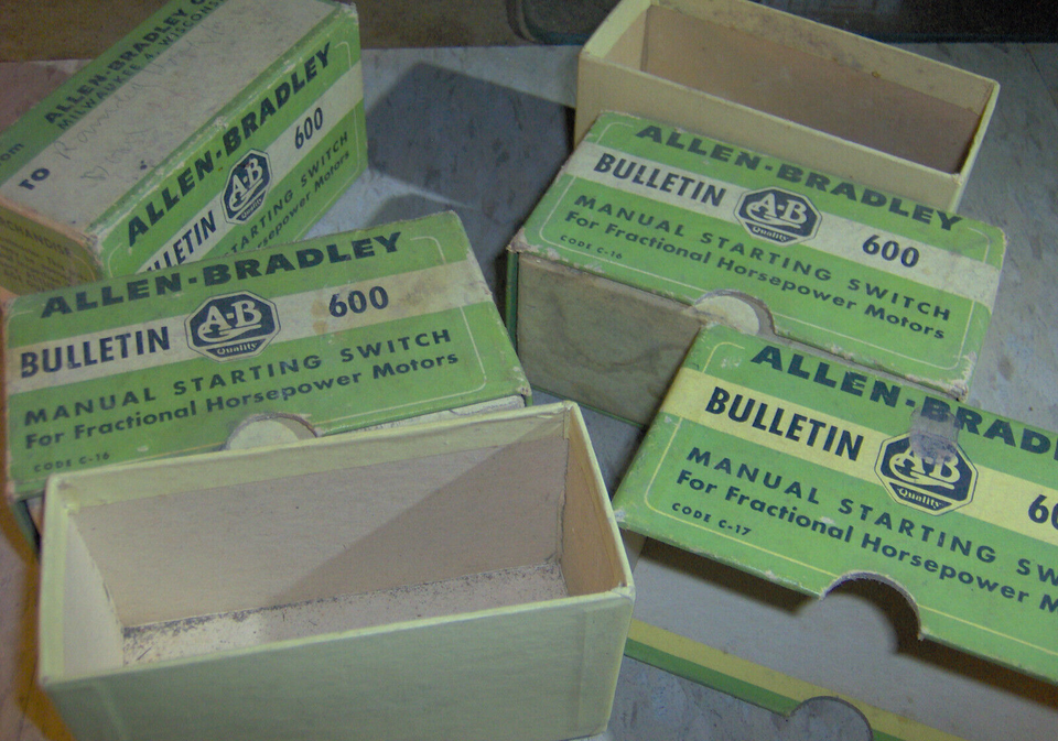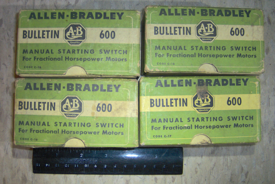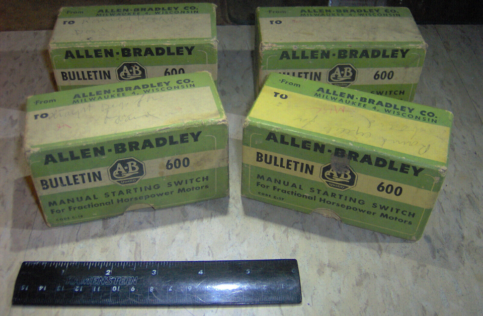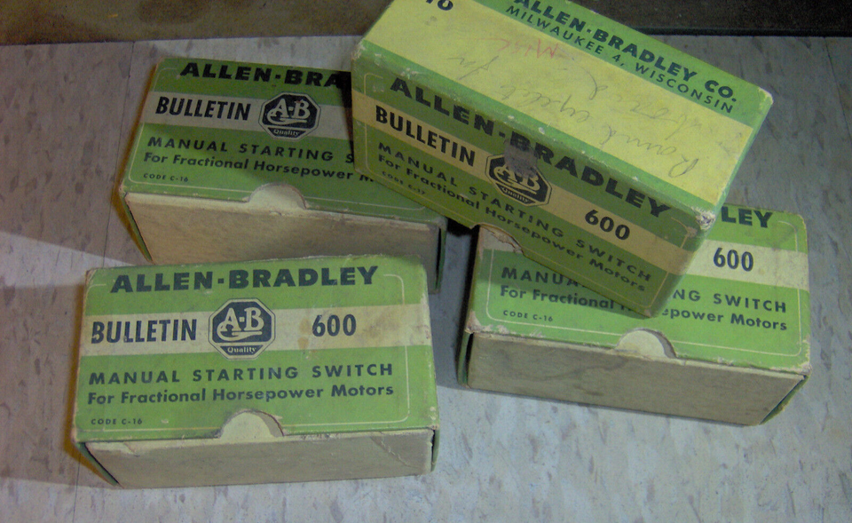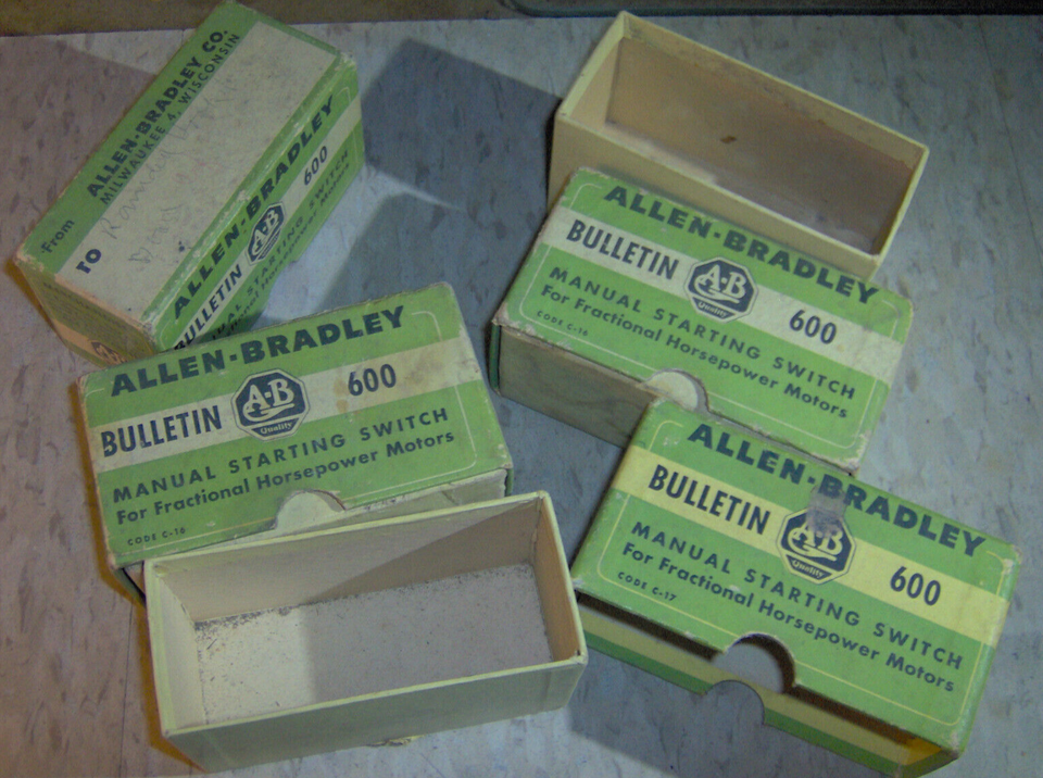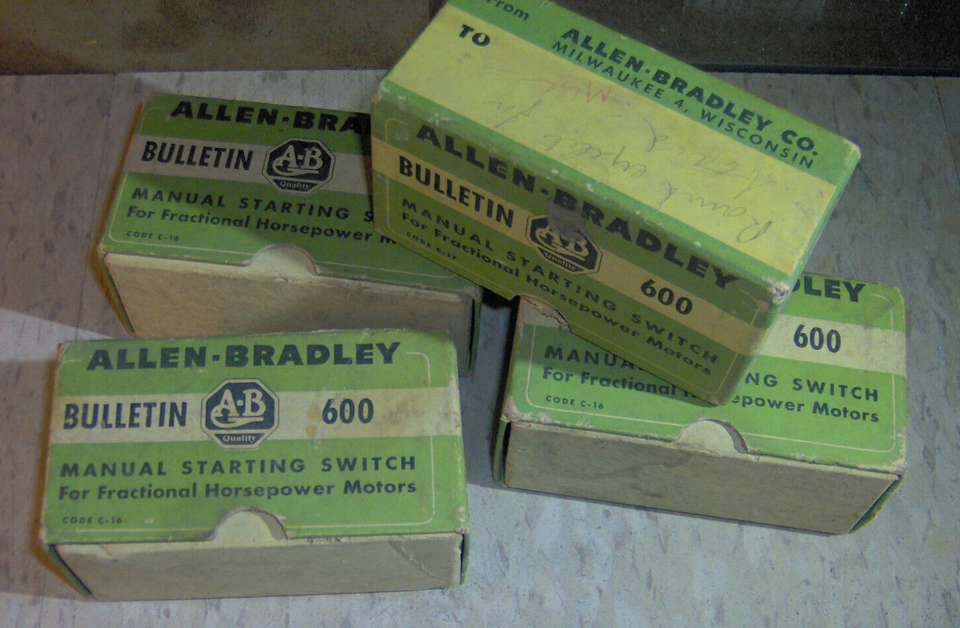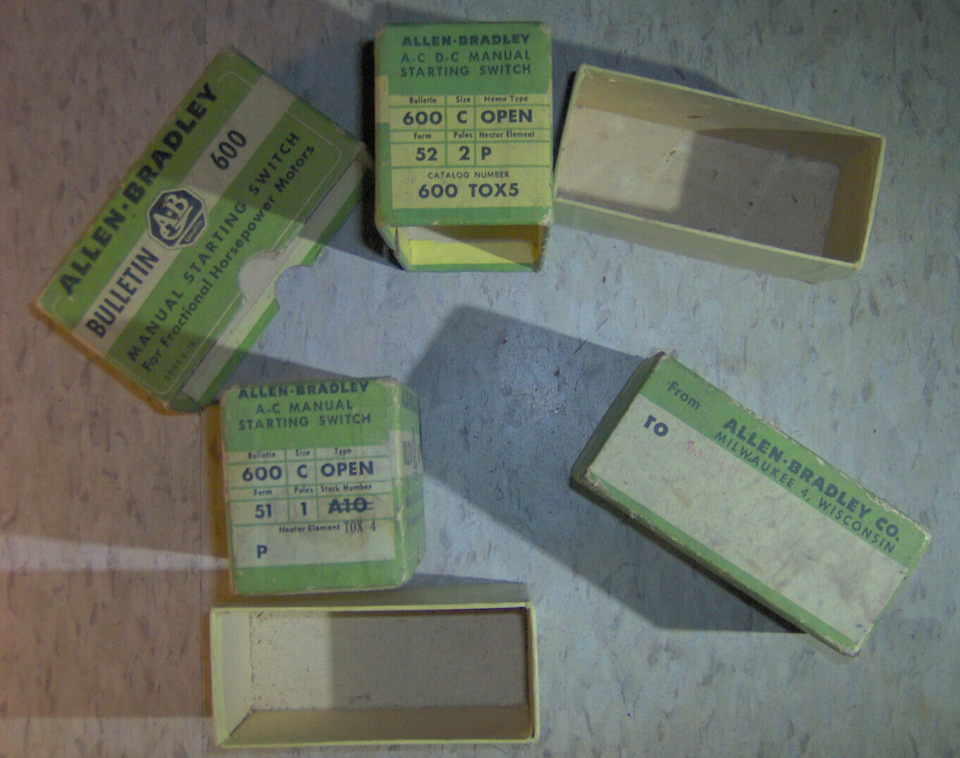 FOR SALE ARE FOUR (4) VINTAGE VERY USED CARDBOARD BOXES FROM ALLEN-BRADLEY BRAND FOR BULLETIN 600 MANUAL STARTING SWITCH FOR FRACTIONAL HORSEPOWER MOTORS. THIS SALE IS FOR THE FOUR (4) BOXES ONLY, NOTHING ELSE IS INCLUDED HERE. EACH VINTAGE CARDBOARD BOX IS FROM ABOUT 1960s, POSSIBLY EARLIER, MEASURES 4 1/4" long x 2" wide X 2 1/4 tall. THESE NEAT LOOKING 50+ YEAR OLD GREEN CARDBOARD BOXES WERE PULLED FROM AN ESTATE FROM THE BACK OF THE SHELF, LIKELY 50+ YEARS OLD. THESE OLD BOXES WOULD MAKE A GREAT DISPLAY IN THE RETAIL STORE OR FOR THE ELECTRIC SUPPLY SHOP, ETC. THE MANUAL STARTING SWITCH LOOKED MUCH LIKE A MODERN WALL LIGHT SWITCH AND WAS USED WITH SMALL MOTORS (no switches are included here - only the boxes). YOU WILL RECEIVE FOUR (4) VINTAGE CARDBOARD BOXES FROM ALLEN-BRADLEY FOR MANUAL STARTING SWITCH, JUST AS
