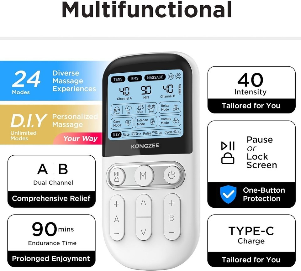 4 In 1 DIY: Experience the versatility of our dual-channel TENS EMS muscle stimulator, designed for customized pain relief. Effortlessly switch between modes to find what works best for you.