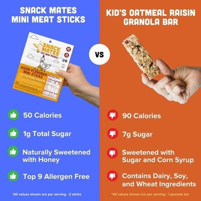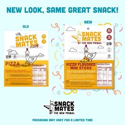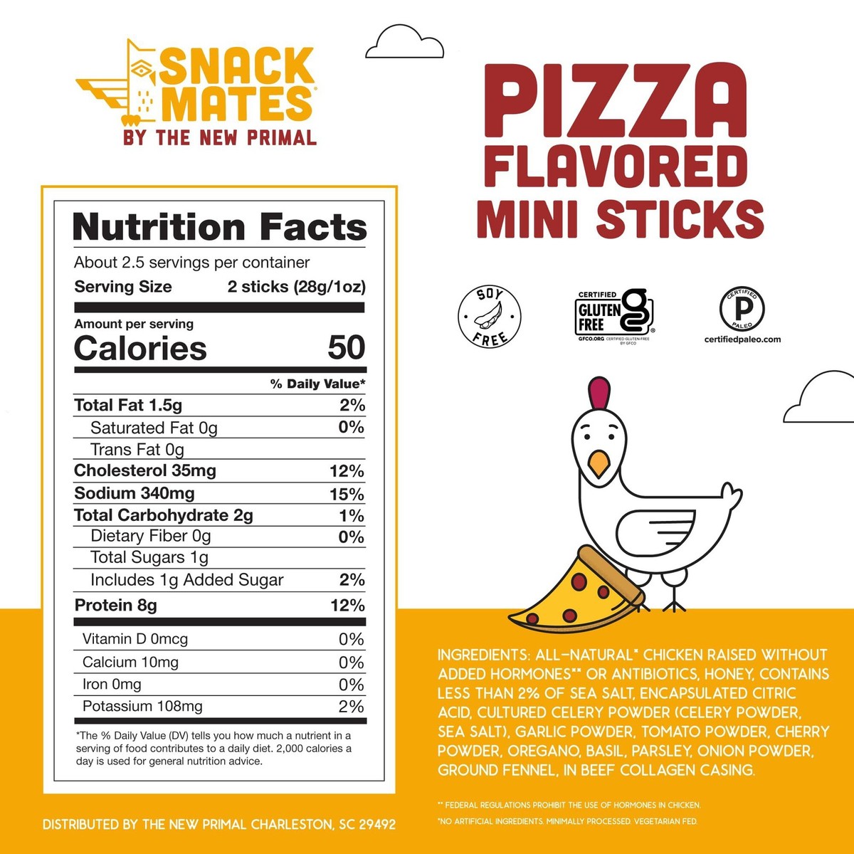 ? PIZZA CHICKEN STICK FOR KIDS: All-natural chicken stick infused with oregano, basil, and garlic over tomato, onion, and red pepper. Totally reminiscent of the best slice in the box. Perfect for convenient snacking at home or on the go. Includes 40 mini chicken jerky sticks! ? HEALTHY SNACKS FOR ON THE GO: Our Snack Mates Pepperoni Pizza flavored Chicken Stick is great for snacking anytime and anywhere, whether your little one is at school, traveling, playing outside, camping, or relaxing at home. These mess free individually wrapped snacks are easy to eat on the go compared to beef jerky or other meat snacks! ? EASY-TO-EAT MEAT STICK: Our Chicken Stick is the perfect, portable protein snack for school. An easy-to-eat individually wrapped meat snack for kids with 8g of protein and just 50 calories per serving. ? KIDS SNACKS YOU CAN FEEL GOOD ABOUT: Top 9 allergen friendly! These gluten free snacks for kids are made with all-natural poultry raised without added hormones or antibiotics and have only 1g of natural sugar from honey. They're nut free, paleo, gluten-free, lunchbox friendly. ? NEW PRIMAL: Our convenient low sugar and low carb protein snacks pack crave-able flavor, simple ingredients, and plenty of protein into one easy to eat stick. Delicious, on-the-go snacking has never been easier.