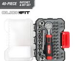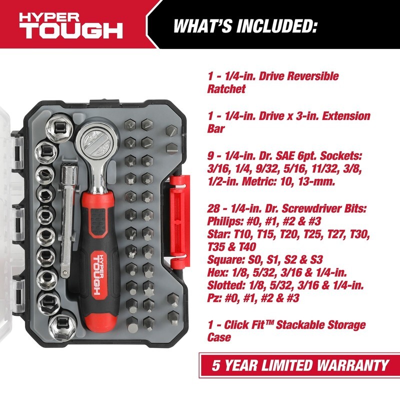 Hyper Tough 40-Piece Socket and Bit Set in Click Fit Case Comes with clear Click-Fit storage case Compatible with the Click-Fit interlocking case system Great for automotive, home repair, and general maintenance (28) 1-in. Screwdriver Bits Reversible Ratchet x 3-in. Extension Bar (9) 1/4-in. Drive 6-point Sockets: SAE: 3/16, 1/4, 9/32, 5/16, 11/32, 3/8, 1/2-in., Metric: 10, 13mm (4) Slotted: 1/8, 5/32, 3/16 1/4-in (4) Philips: #0, #1, #2 #3 (8) Star: T10, T15, T20, T25, T27, T30, T35 T40 (4) Hex: 1/8, 5/32, 3/16 1/4-in. (4) Pz: #0, #1, #2 #3 (4) Square: S0, S1, S2 S3 (1) Coupler