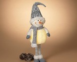 Here is a new large size lighted snowman, this is battery operated with a timer, this is made of plastic and fabric, the body is made of hard plastic and is dressed in a gray and white knit outfit and hat and has a white fur body, so neat, the material pulls up under belly so you can put batteries in the back battery box built in body, this requires 3 AAA Batteries that are Not Included, and pine cones not included, this snowman stands and measures 41 inch tall by 14 inch wide at widest point, nice large size standing snowman.
