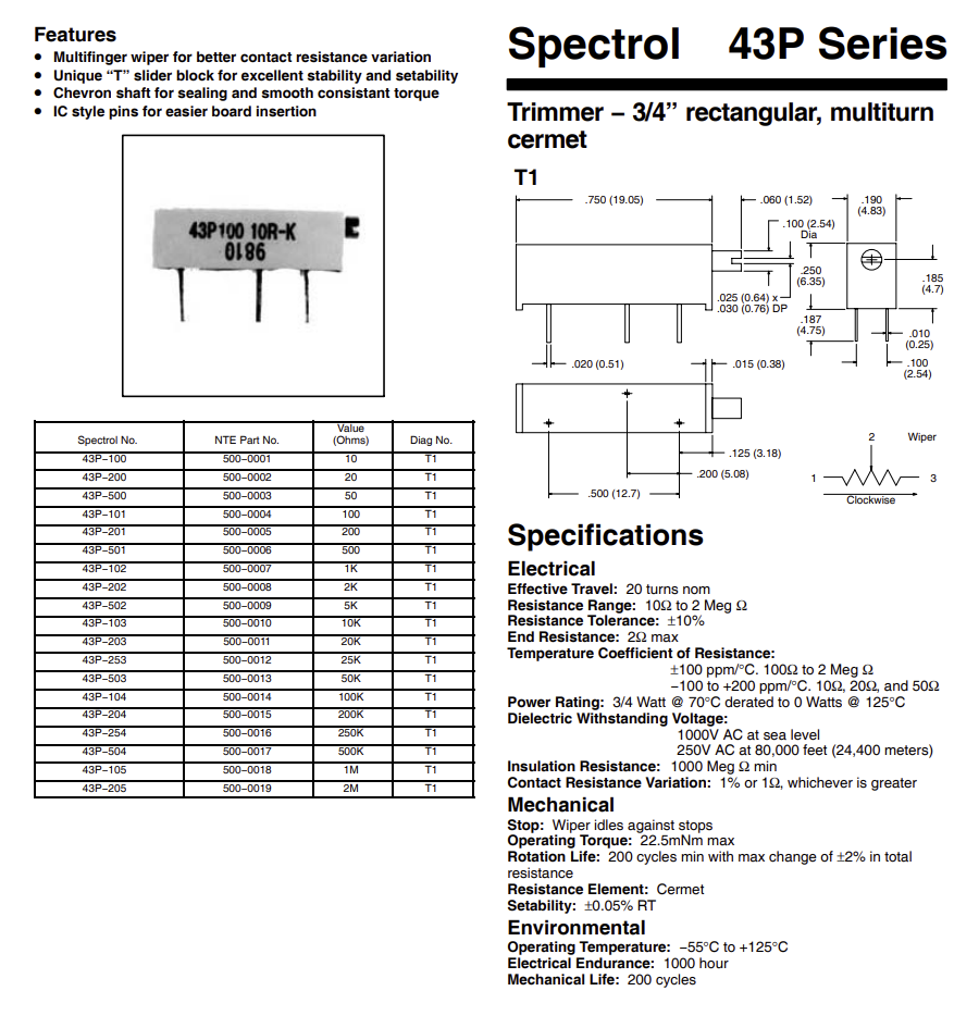 - 4PCS M43P105K 43P105 1MK Spectrol Multi Turn Trimmer 1M Ohm 10% Potentiometer