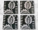 This product is a set of 4 square beverage coasters, made l in a bohemian style. Each coaster is black in color and measures 4 inches in length and width. These coasters are handcrafted in India, adding a unique and authentic touch to your barware collection. Perfect for adding a touch of elegance to your home decor while providing a stylish way to place your drinks.