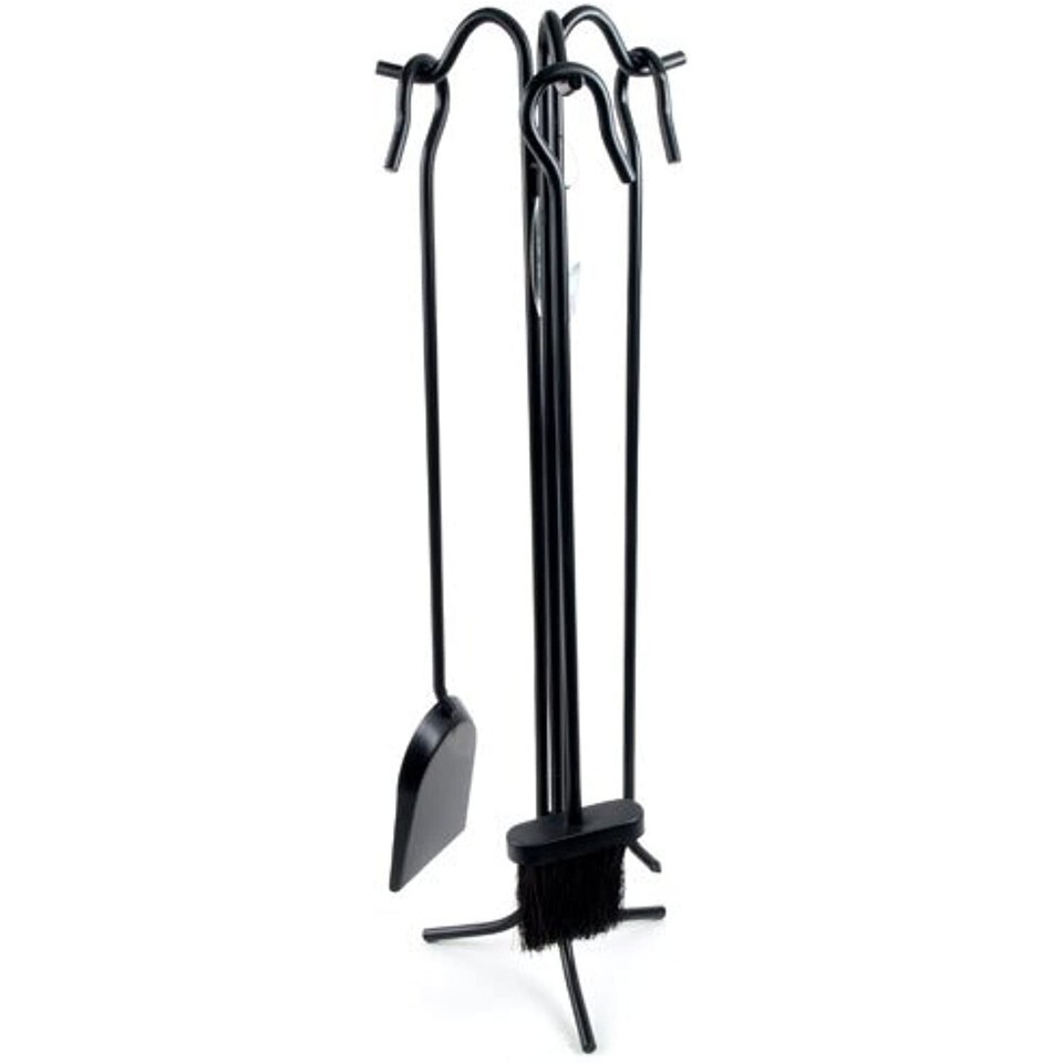 Bring traditional color and style to your fire tending using this Panacea Black Classic Fireplace Tool Set. This streamlined, steel set provides the tools you need to keep your fireplace tidy, and its black color meshes with many settings. Three joined steel rods create the stand, each culminating in an arched top and small hook which holds the included poker, shovel, and broom. Each of the three feet arc slightly outward for stability, and the compact footprint occupies minimal space on the hearth. The black finish of each piece lends them a timeless look, and the steel construction remains durable. Place convenient tools next to your hearth with this Black Classic Fireplace Tool Set.