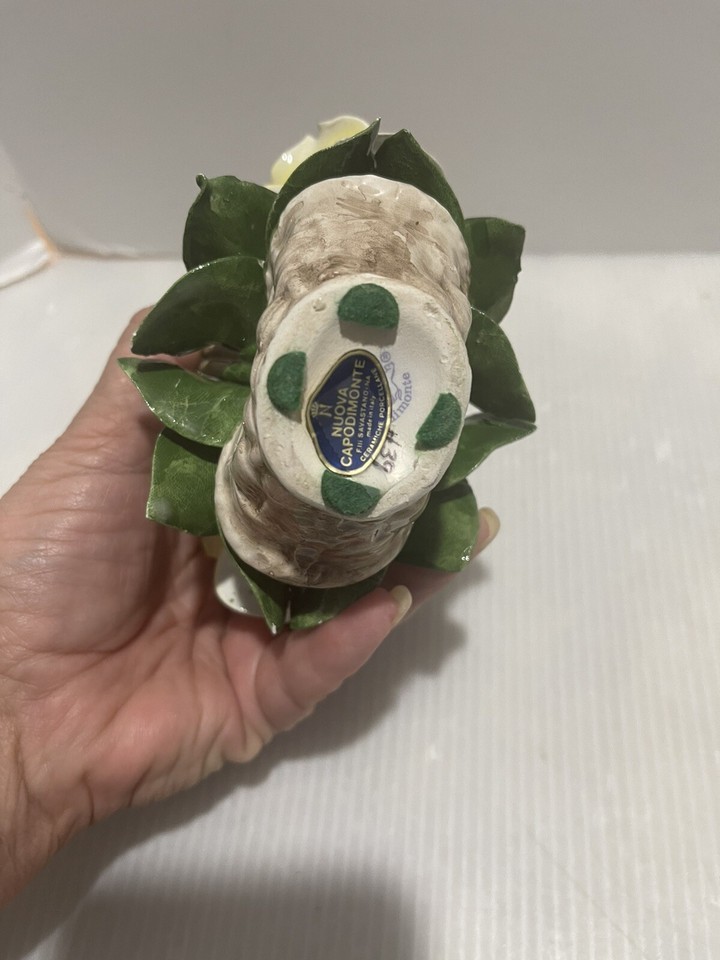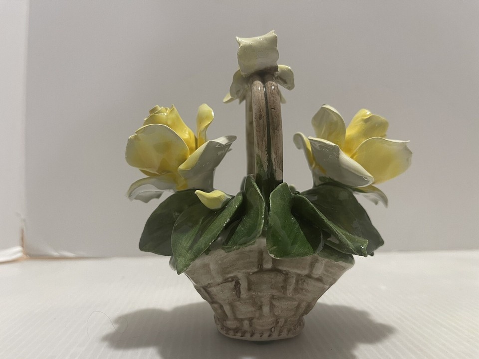- 5 1/2" Porcelain Capodimonte Yellow Roses in Basket with Yellow Bow On Top