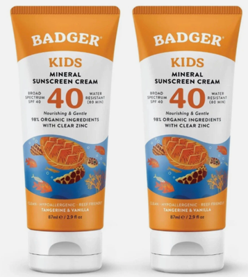 - 5/2028 2x Badger Kids Mineral Sunscreen Cream SPF 40, 98% Organic Ingredients, Z