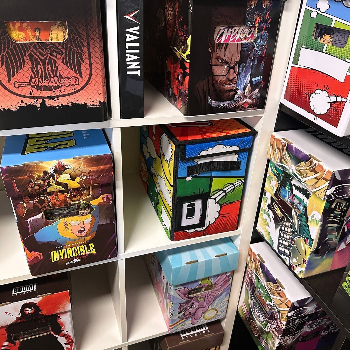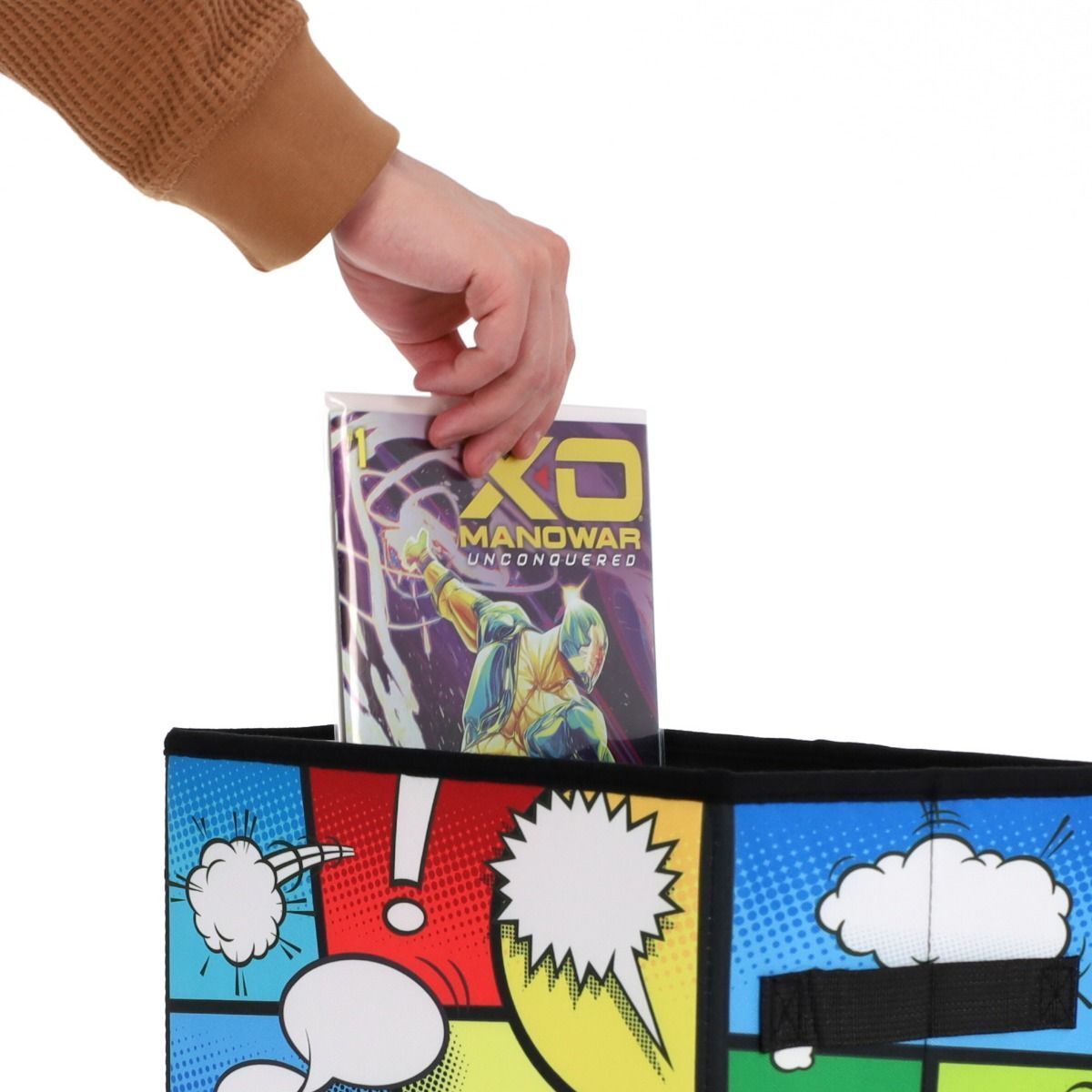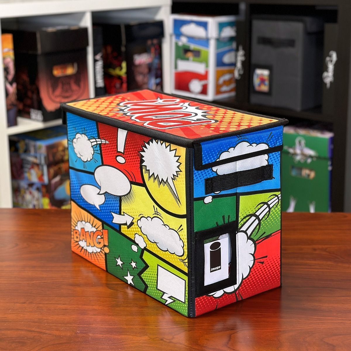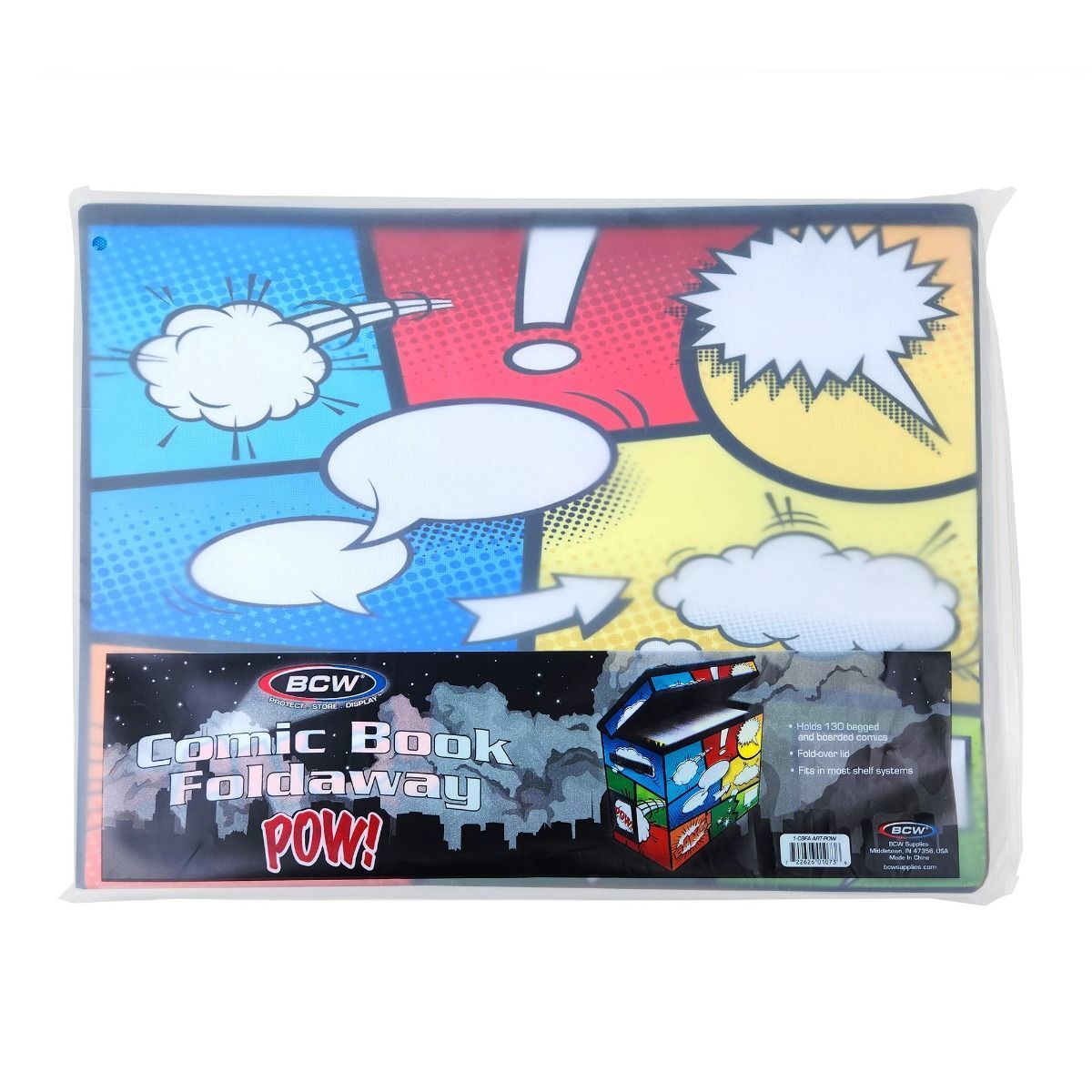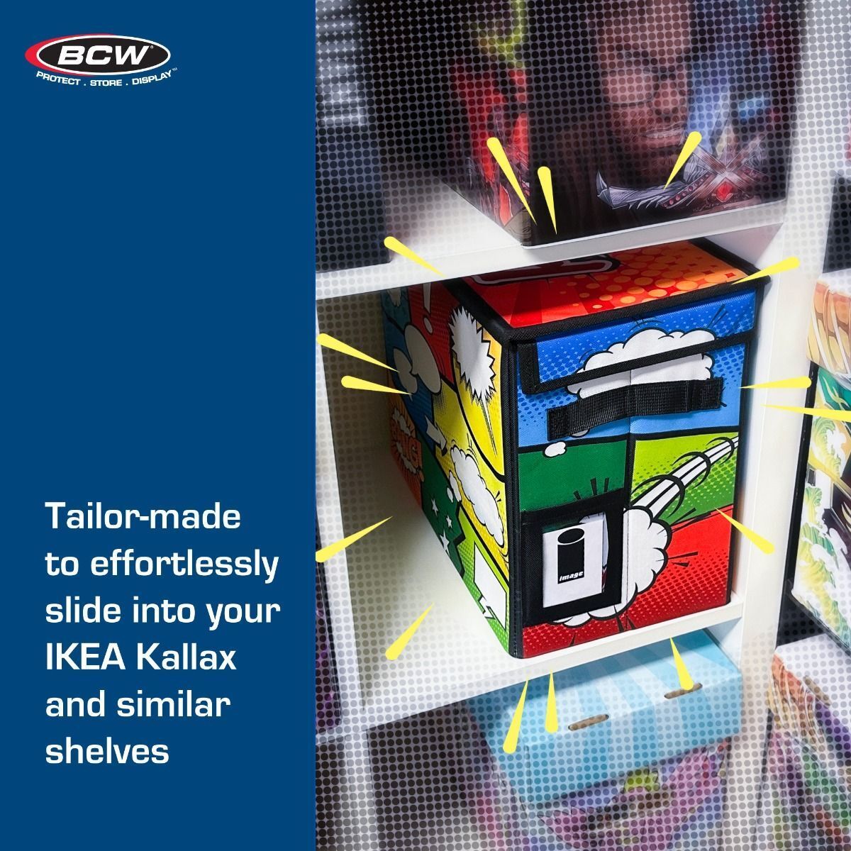 The POW! Art Foldaway is a colorful twist on BCW's classic gray Foldaway. The BCW Comic Foldaway is a collapsible storage tote designed to hold 125-150 comic books. It fits easily in Ikea shelf systems, like the Kallax without hanging over the edge. It features a fold-over lid, rigid sides and bottom, stitched-on carrying handles, and a slot to insert a card to mark the contents of your box.