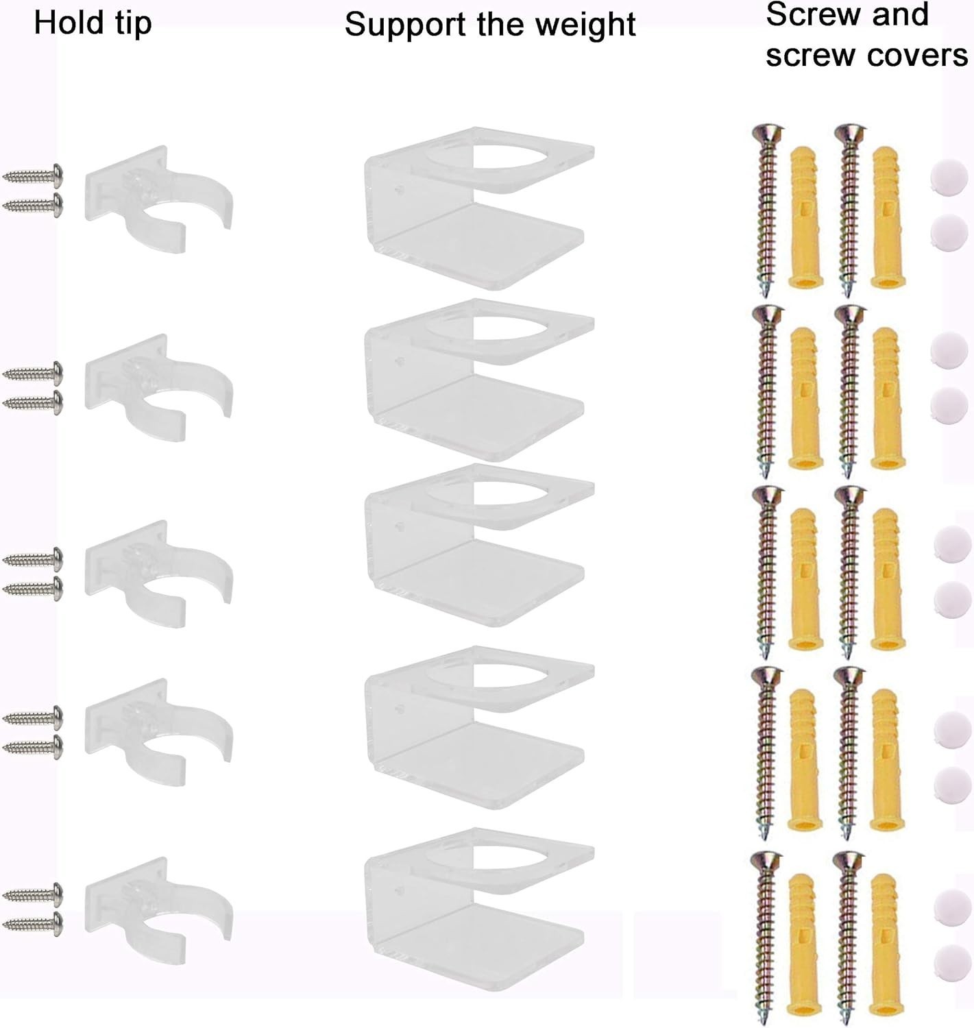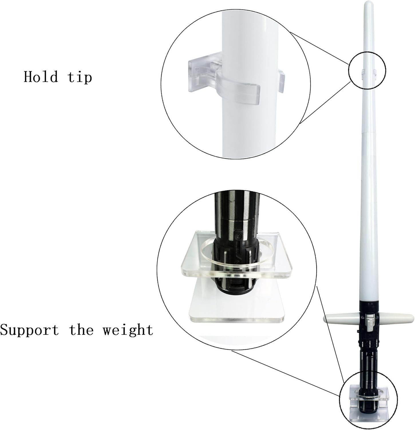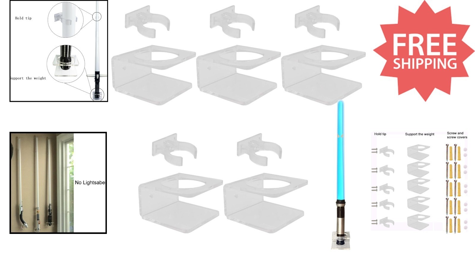 Discover our patented lighting display solution, designed to elegantly showcase your lightsabers. This set includes 5 clear acrylic blade holders and 5 wall mount clips, all with hardware for quick and secure installation. The transparent design ensures a discreet look that complements any decor, with easy-to-peel films revealing pristine clarity. Each holder supports up to 10 pounds, making it sturdy enough for most lightsabers. Included screw covers provide a polished finish. Easy to use and install, these holders will beautifully enhance your living room or bedroom. Please note, lightsabers are not included.