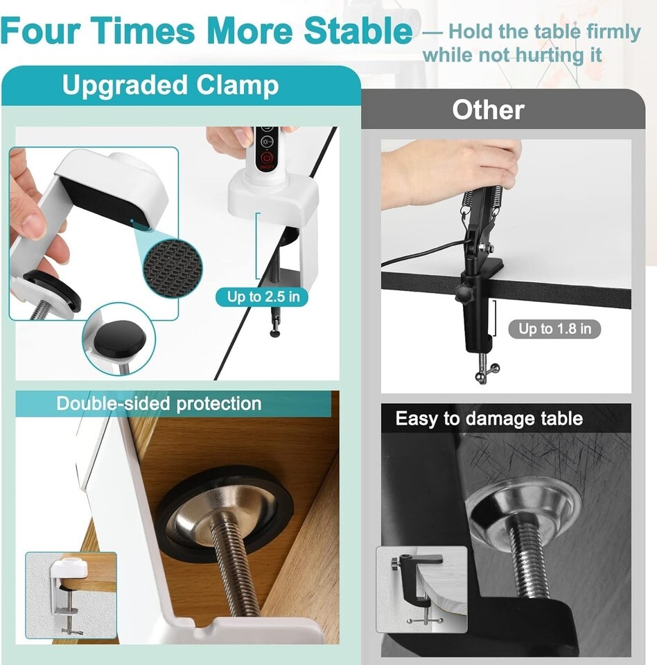 Enhanced 2-in-1 Design: Enjoy a robust, improved clip design that ensures firm stability on your desktop, accommodating larger clip distances for different workbenches. Protective pads prevent damage to your surfaces.