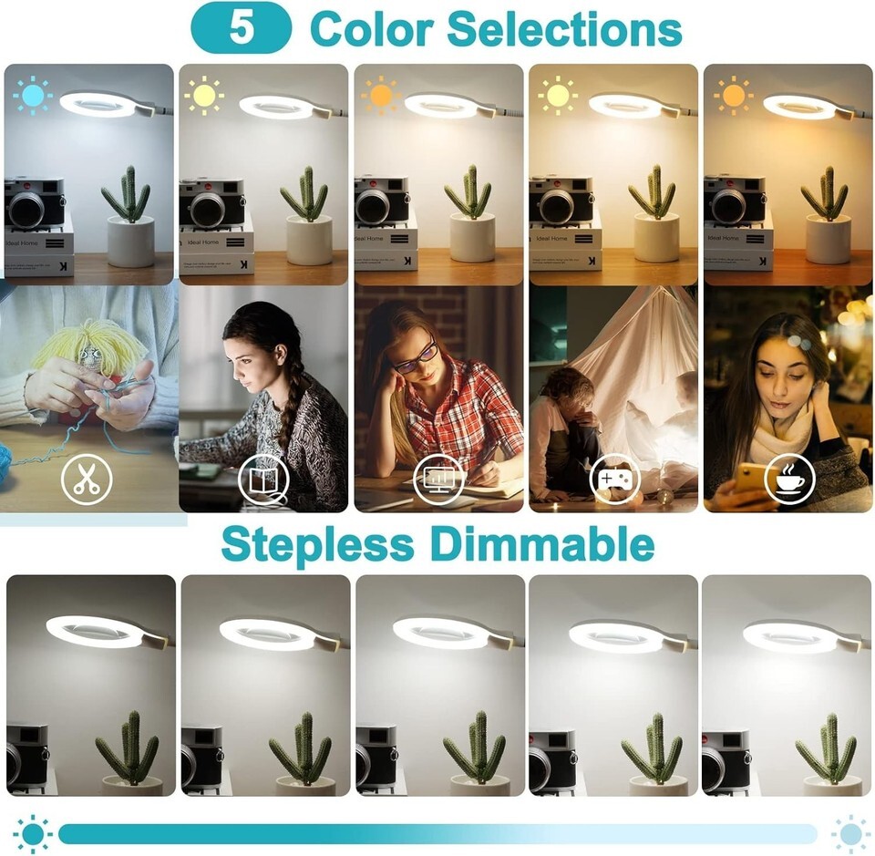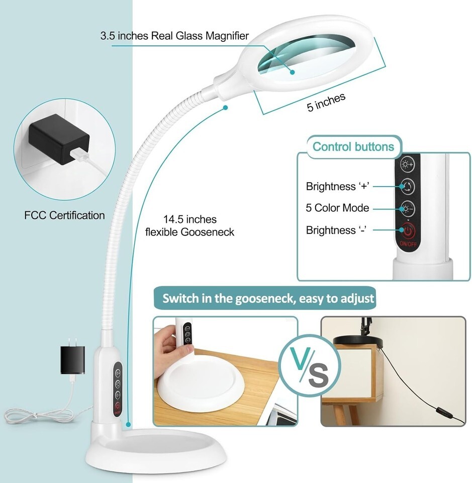 Convenient Button Control: Unlike traditional magnifying lamps with switches on the power cord, our innovative design features a button on the gooseneck for easy access to adjust five color modes and stepless dimming brightness.
