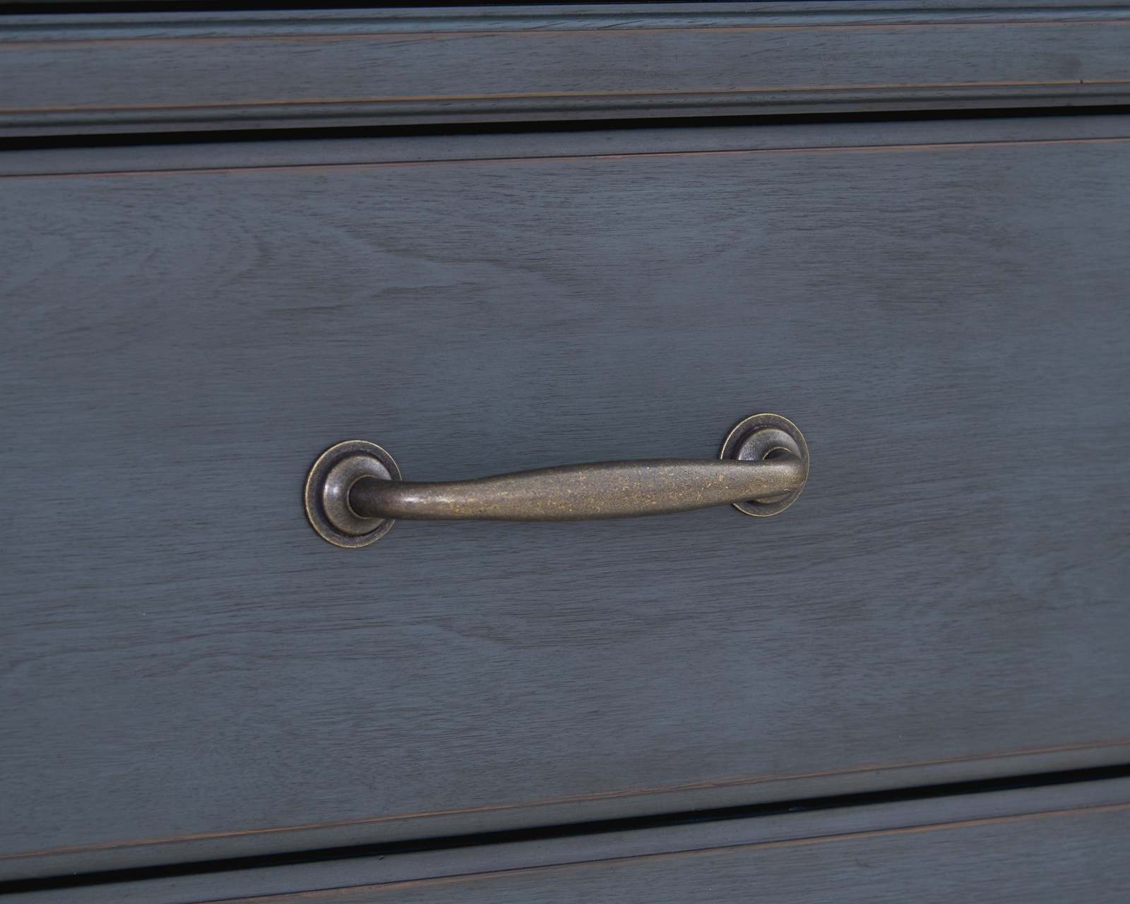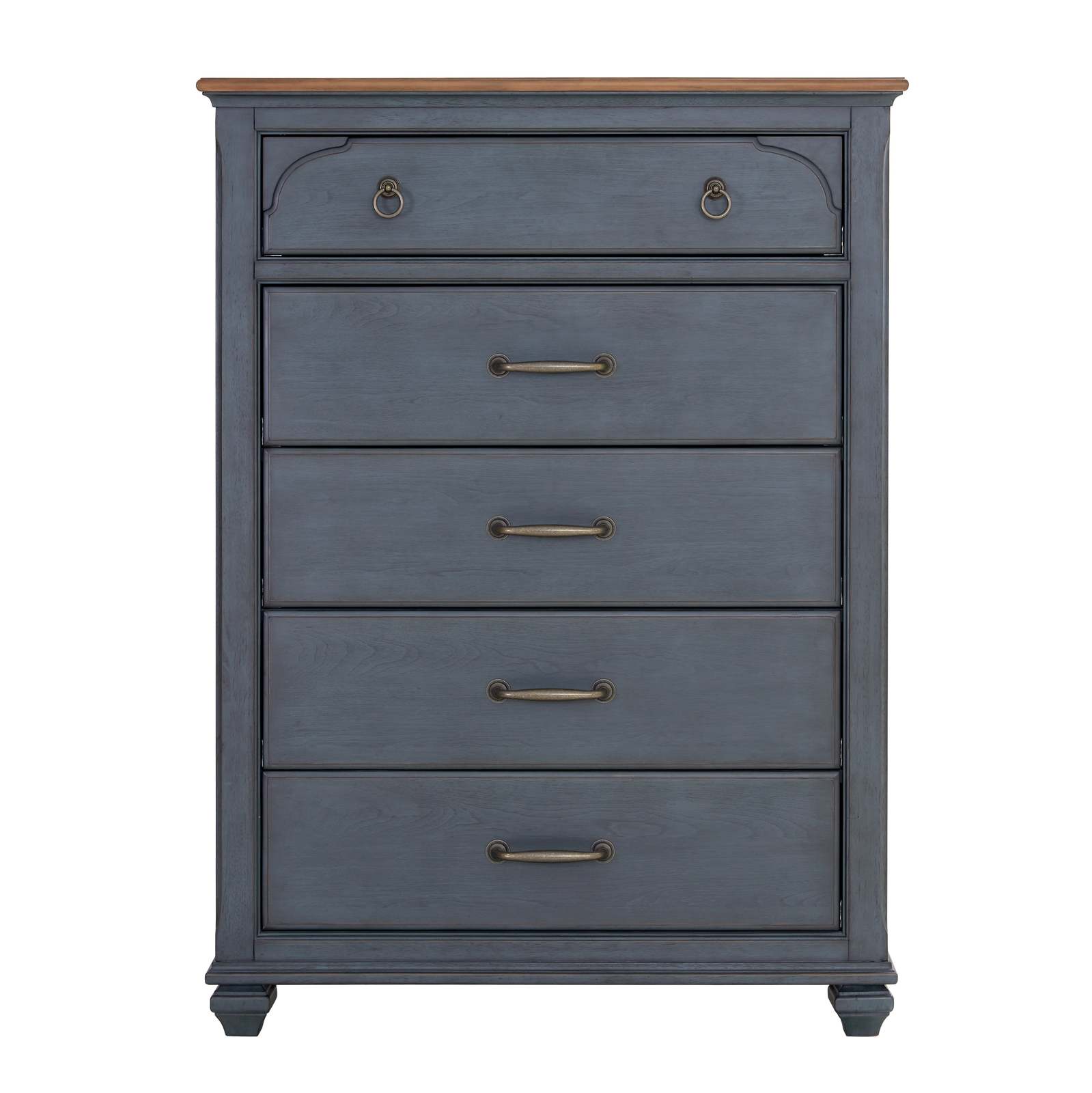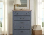 This Chest boasts a refreshing coastal twist on traditional style. Skillfully crafted from Rubberwood Solids and Birch Veneers, the subtle distressing Corduroy Blue finish and Antique Pewter hardware give this Chest an updated look with a timeless heirloom feel. Featuring five drawers with felt lined top drawer, this Chest will provide ample storage space for clothing and accessories. Just like Baseball, Apple Pie and Rock Roll, this Chest of Drawers will become a beloved favorite in your home. Fully assembled upon arrival, this piece is ready to unbox and enjoy