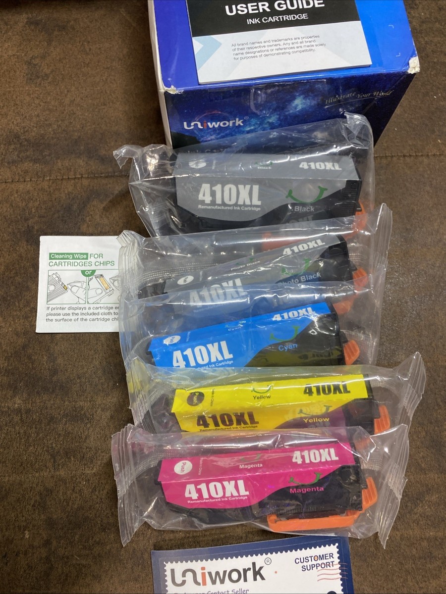 The 5 PK 410XL Ink Cartridge by Uniwork is compatible with Epson printers such as the Stylus XP630, XP635, XP640, XP830, and XP7100. This ink cartridge set includes cyan, yellow, magenta, and black colors, with an expiration date of 11/28/26. Manufactured in China, this compatible ink cartridge comes with a 1-year manufacturer warranty and is designed for inkjet print technology. Ideal for those looking for high-quality ink cartridges to ensure vibrant and long-lasting prints.