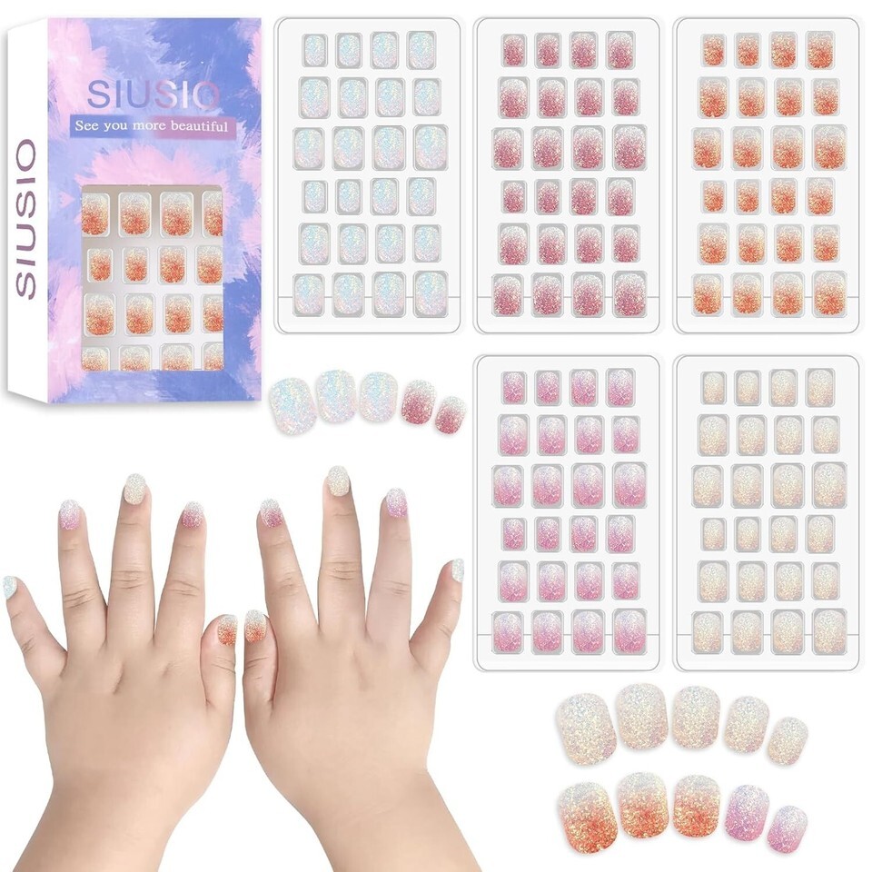 5 Pack of Colorful Glitter Acrylic Fake Nails for Little Girls - 120 Count
