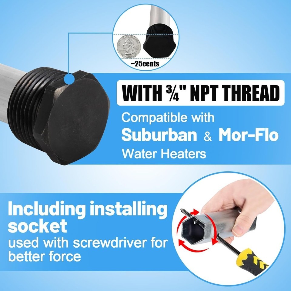Includes 2 pcs anode rods, 1 pcs RV water heater tank flusher, 1 pcs dual hex element socket wrench, and 1 pcs seal tape.