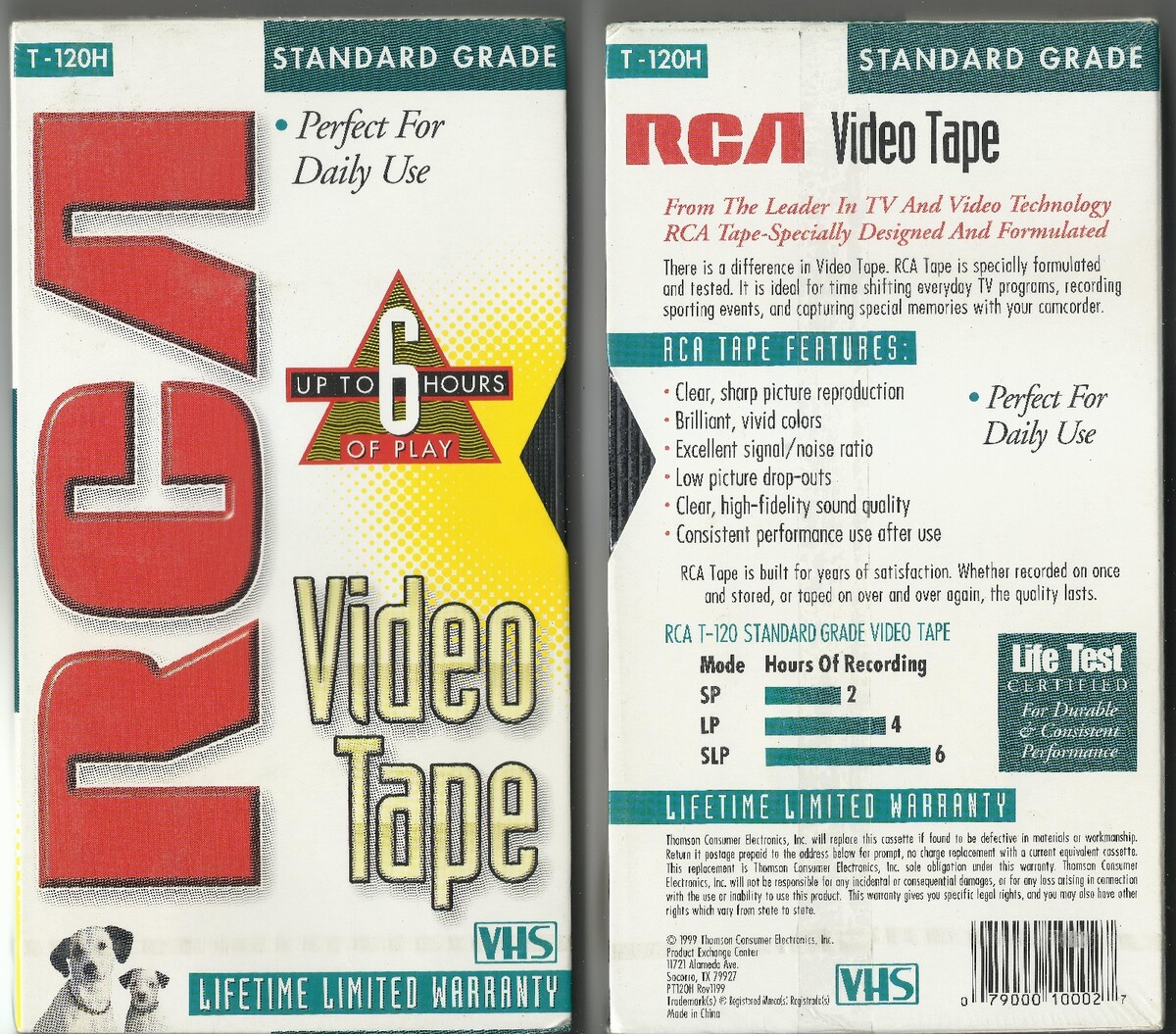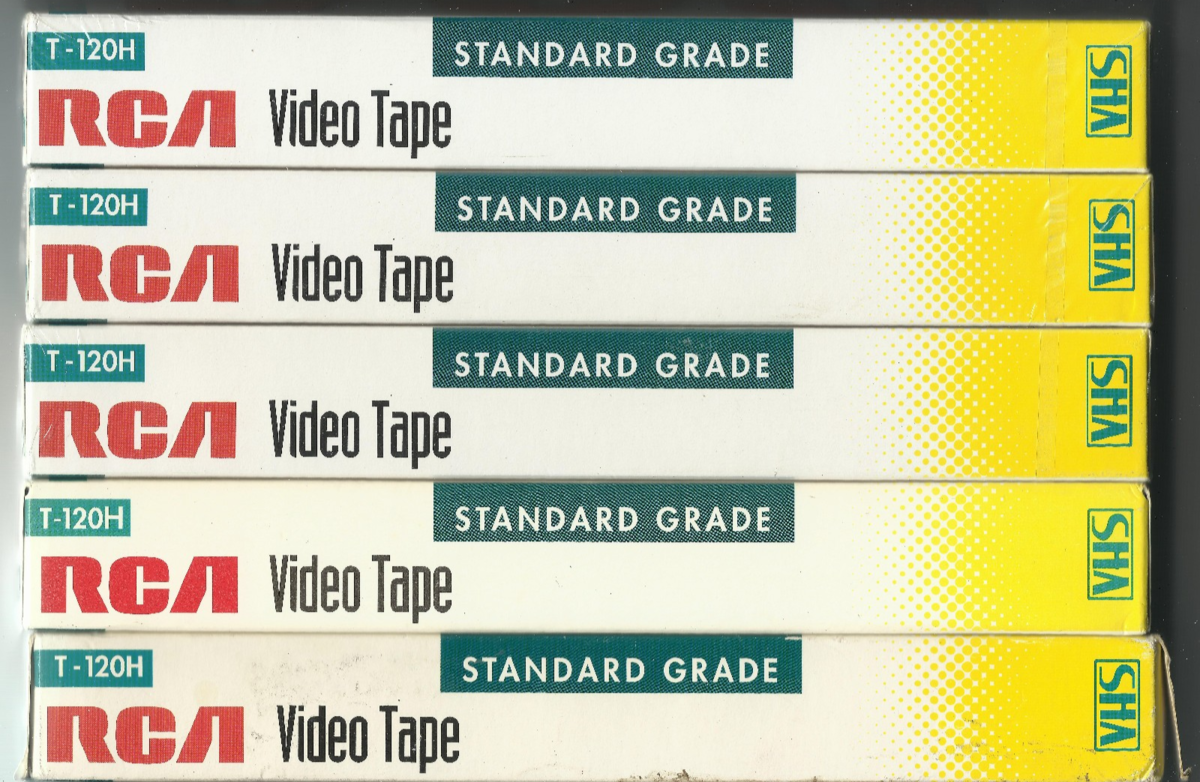 FOR SALE ARE FIVE (5) NEW RCA STANDARD GRADE VIDEO TAPES (3 sealed/2 unsealed) MANUFACTURED BY THOMSON CONSUMER ELECTRONICS INCORPORATED MPN T-120H UPC# 079000100027. UP TO 6 HOURS OF PLAY, THESE STANDARD GRADE VHS VIDEO TAPES ARE BLANK AND NEVER USED. 3 ARE FACTORY SEALED, 2 ARE NOT. YOU WILL RECEIVE FIVE (5) RCA VHS VIDEO TAPES, AS PICTURED, SHIPPED BY USPS....